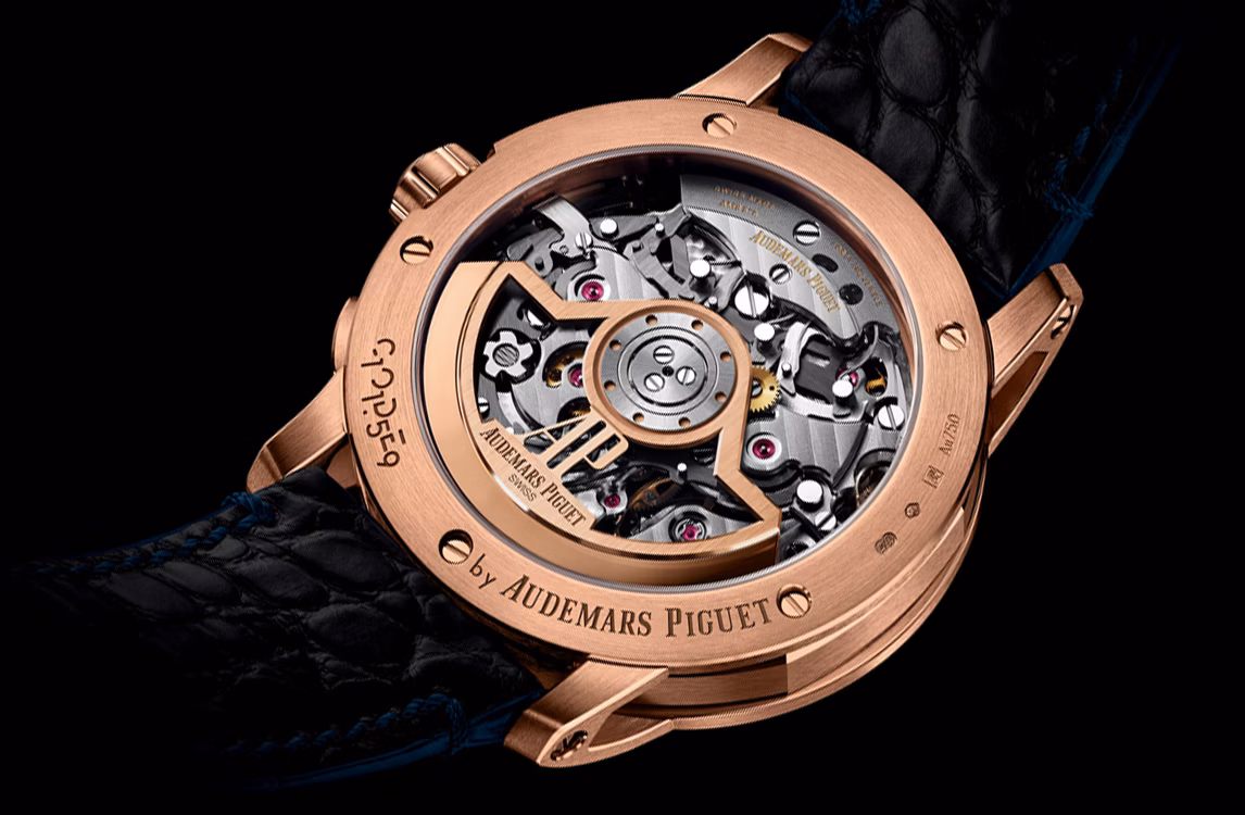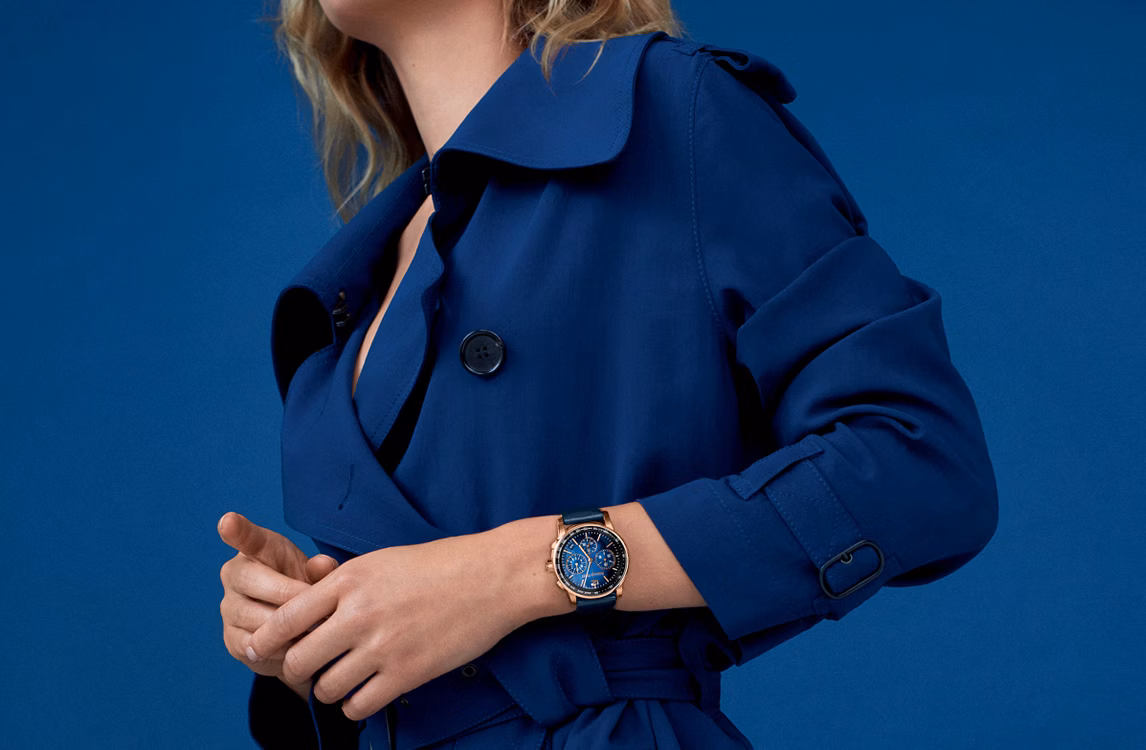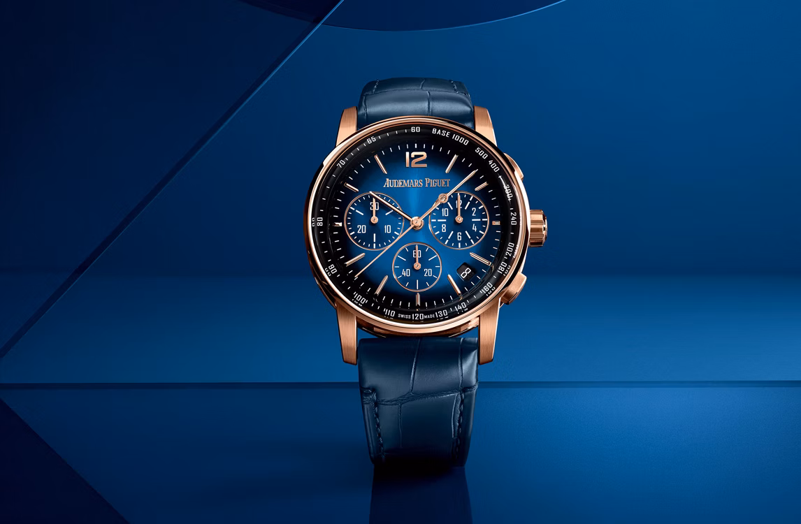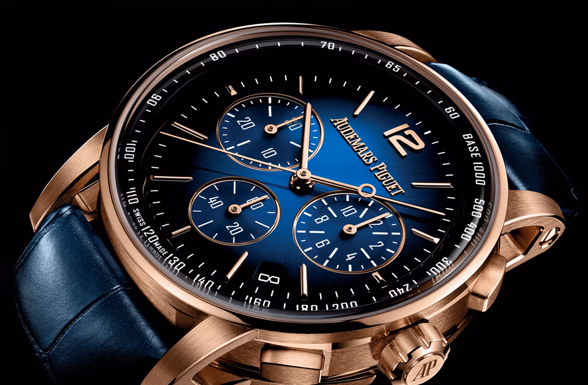 Das Gehäuse des Chronographen aus 18 Karat Roségold ist mit einem rauchig gefärbten, blau lackierten Zifferblatt mit Sonnenschliff versehen und wird von einem passenden, von Hand genähten Armband aus Alligatorleder vollendet.