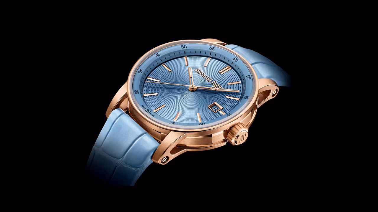 Dieser 38 mm-Zeitmesser für schlankere Handgelenke sorgt mit seinem Gehäuse aus 18 Karat Roségold für elegante Lichteffekte, die durch das hellblaue Zifferblatt und ein farblich passendes Armband aus Alligatorleder unterstrichen werden.
