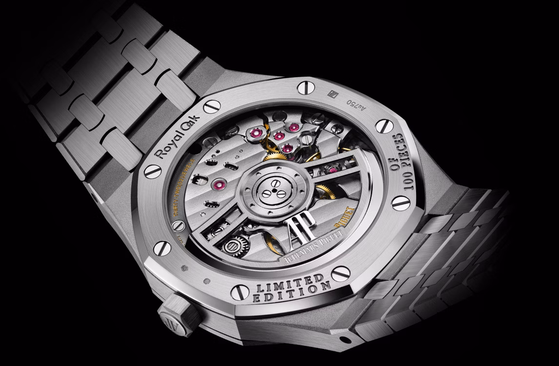 Dieses Jubiläumsmodell der Royal Oak Automatik mit einem Durchmesser von 41 mm ist eine auf 100 Exemplare limitierte Edition, die ein Gehäuse und Armband aus 18 Karat Weißgold mit einem hellblauen „Grande-Tapisserie“-Zifferblatt kombiniert und das aktualisierte Design der Kollektion aufweist.