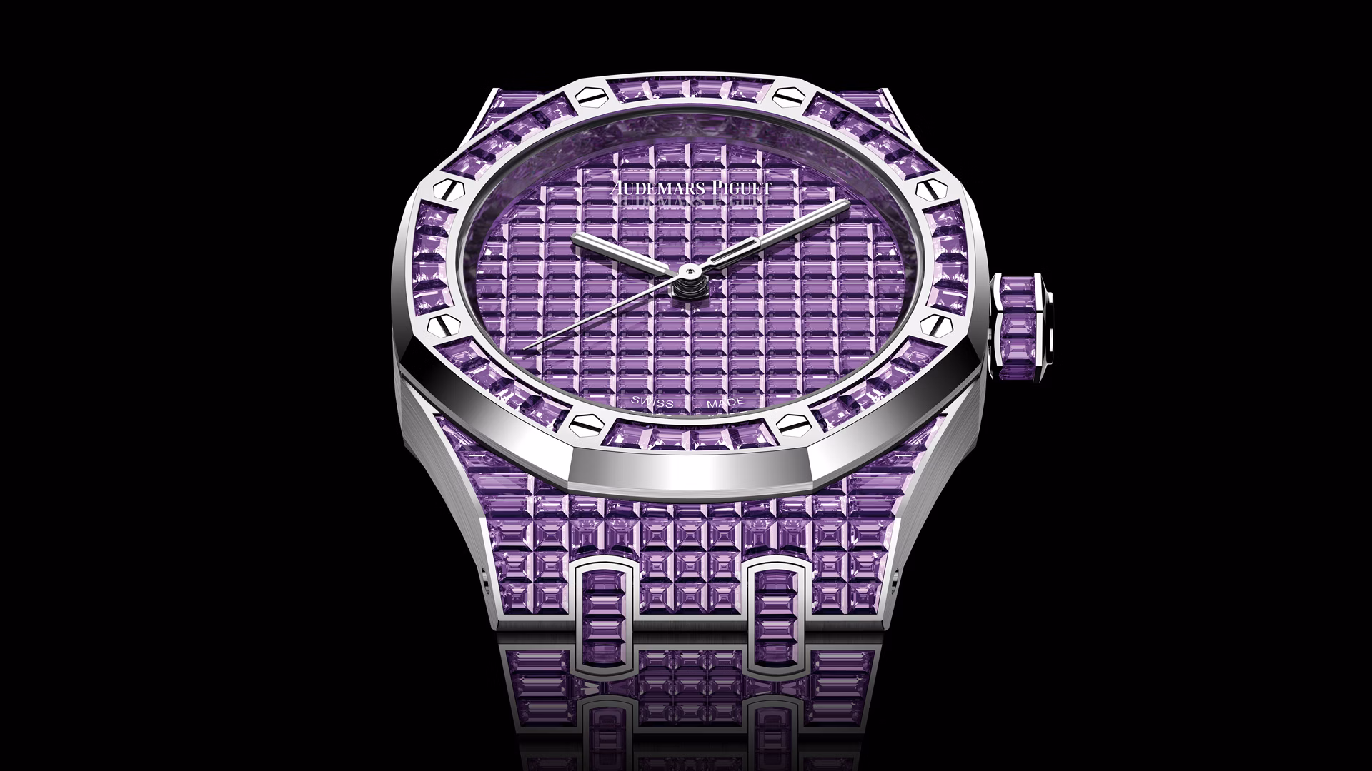 Dieses Modell gehört zu einem Set von zehn Stücken, die alle mit unterschiedlichen Edelsteinen dekoriert sind. Diese 37 mm-Royal Oak Automatik mit Gehäuse und Armband aus Weißgold ist vollständig mit 790 Amethysten im Baguetteschliff (ca. 21,2 Karat) besetzt. Das Modell wurde zudem mit dem neusten Design der Royal Oak versehen. Die „50-years“-Jubiläums-Schwungmasse kann durch den Saphirglasboden bewundert werden.