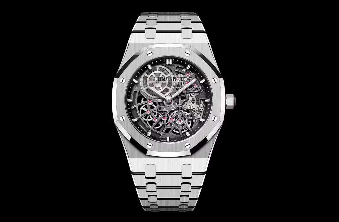 Gehäuse und Armband dieser offen gearbeiteten Royal Oak „Jumbo“ Extraflach aus 18 Karat Weißgold kontrastieren elegant mit dem offen gearbeiteten Uhrwerk in Dunkelgrau, das sich von beiden Seiten als echter Hingucker erweist.