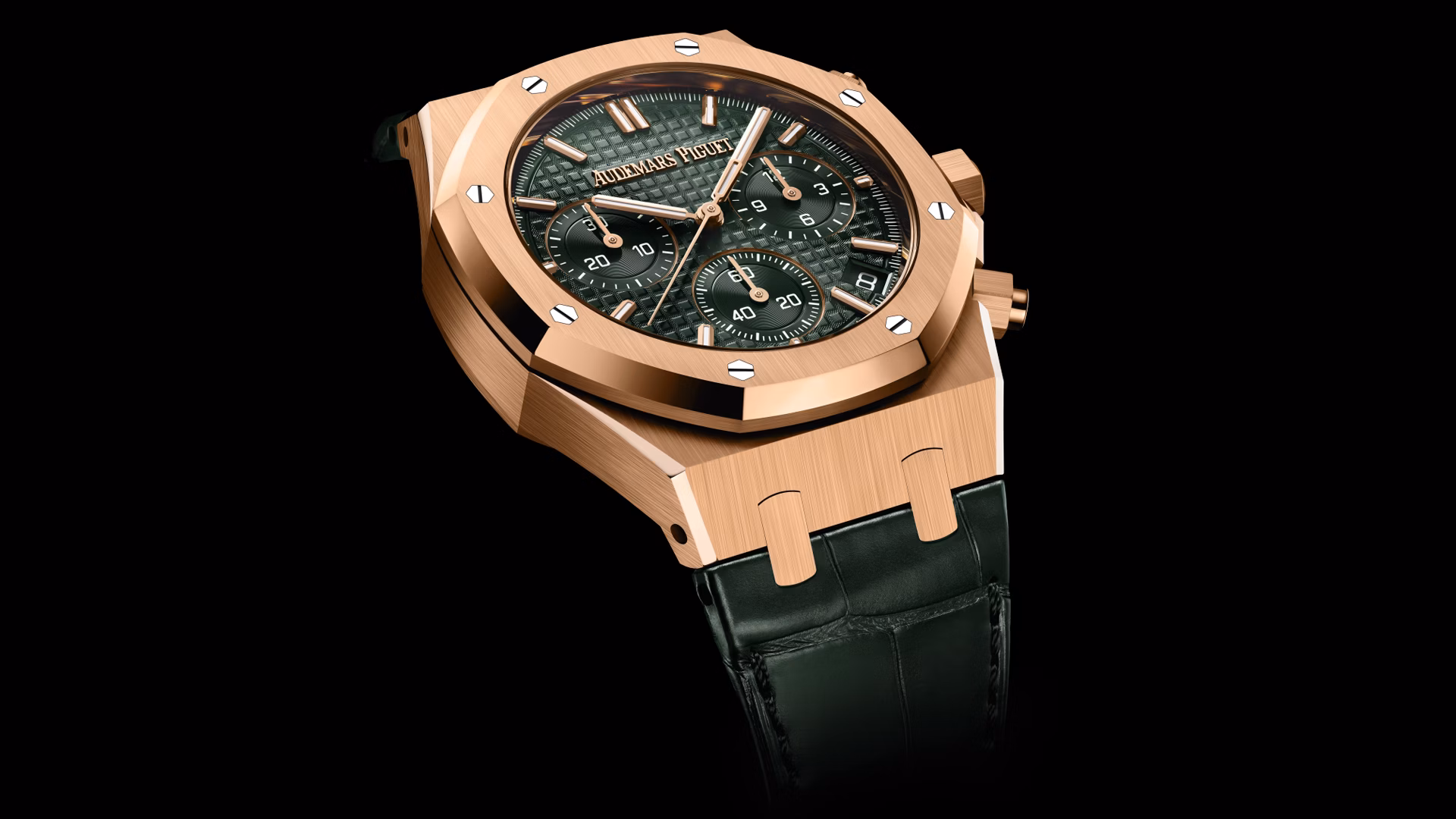 Dieser 41 mm-Chronograph im aktualisierten Royal Oak-Design verbindet 18 Karat Roségold mit einem khakifarbenen „Grande Tapisserie“-Zifferblatt samt passendem Alligatorleder-Armband. Die „50-years“-Schwungmasse ist durch den Saphirglasboden sichtbar.