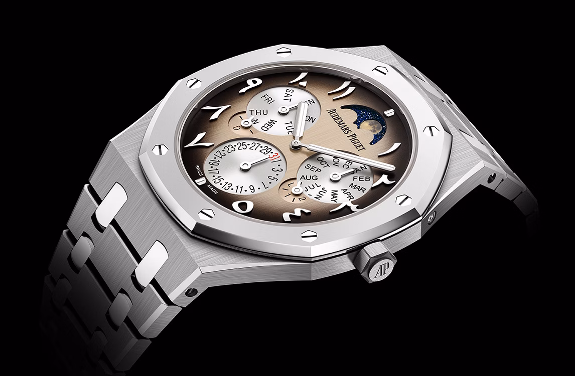 Zifferblatt aus rauchigem Elfenbein, vertikale Satinierung, mit aufgesetzten speziellen, ostarabischen Indexen aus Weißgold und Royal Oak-Zeigern mit Leuchtbeschichtung.