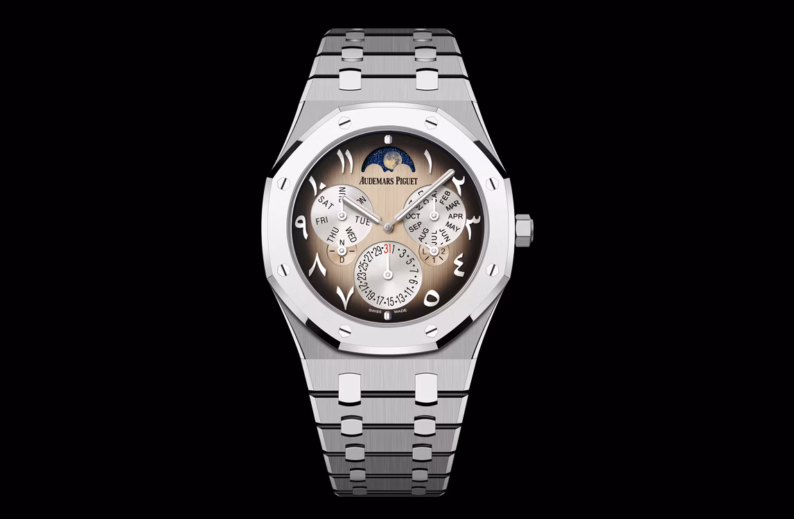 Die Kombination aus satiniertem Titan und poliertem BMG sorgt bei dieser limitierten Edition für intensive Lichtspiele. Das satinierte Zifferblatt aus rauchigem Elfenbein ist mit silbernen Zählern und ostarabischen Ziffern aus Weißgold versehen. Die Anzeige des ewigen Kalenders wurde neu gestaltet und verfügt über eine speziell entwickelte Mondanzeige bei 12 Uhr.