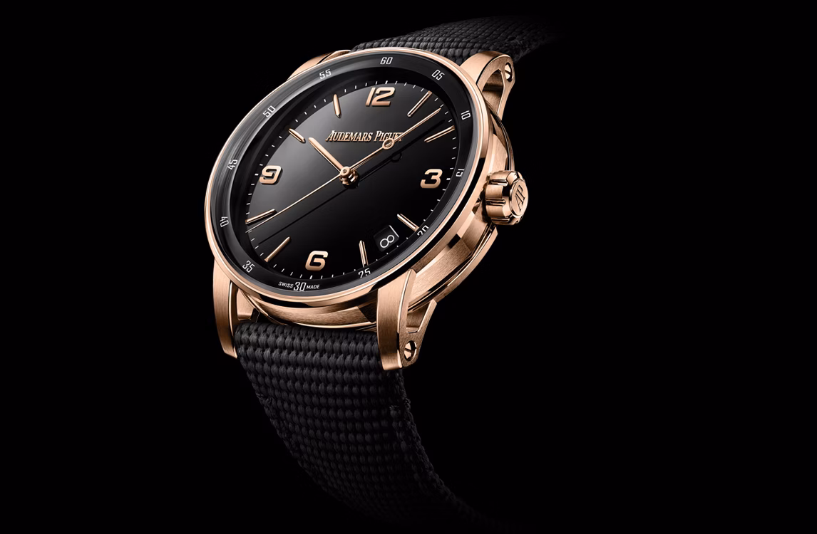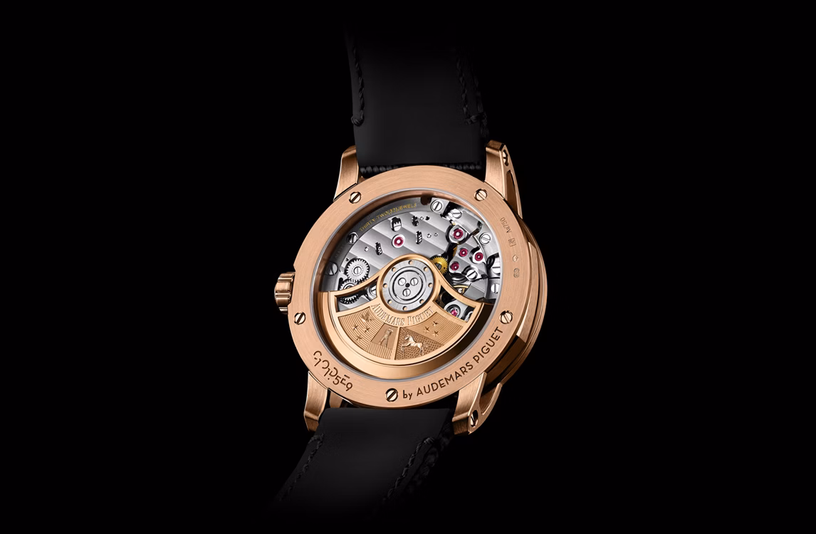 The black lacquered dial is enhanced by the 18-carat pink gold case, an applied gold 3D Audemars Piguet signature in galvanic growth, as well as curved gold hour-markers.