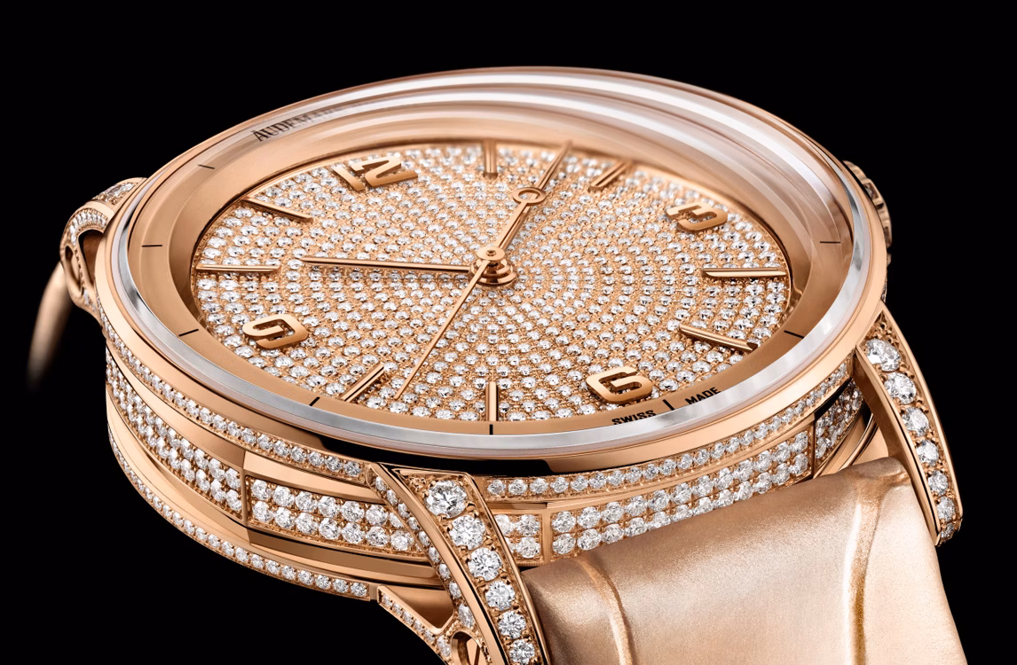 473 brilliant-cut diamonds; ~2.7 carats (case), 612 brilliant-cut diamonds; ~2.3 carats (dial), 34 brilliant-cut diamonds; ~0.2 carats (buckle).