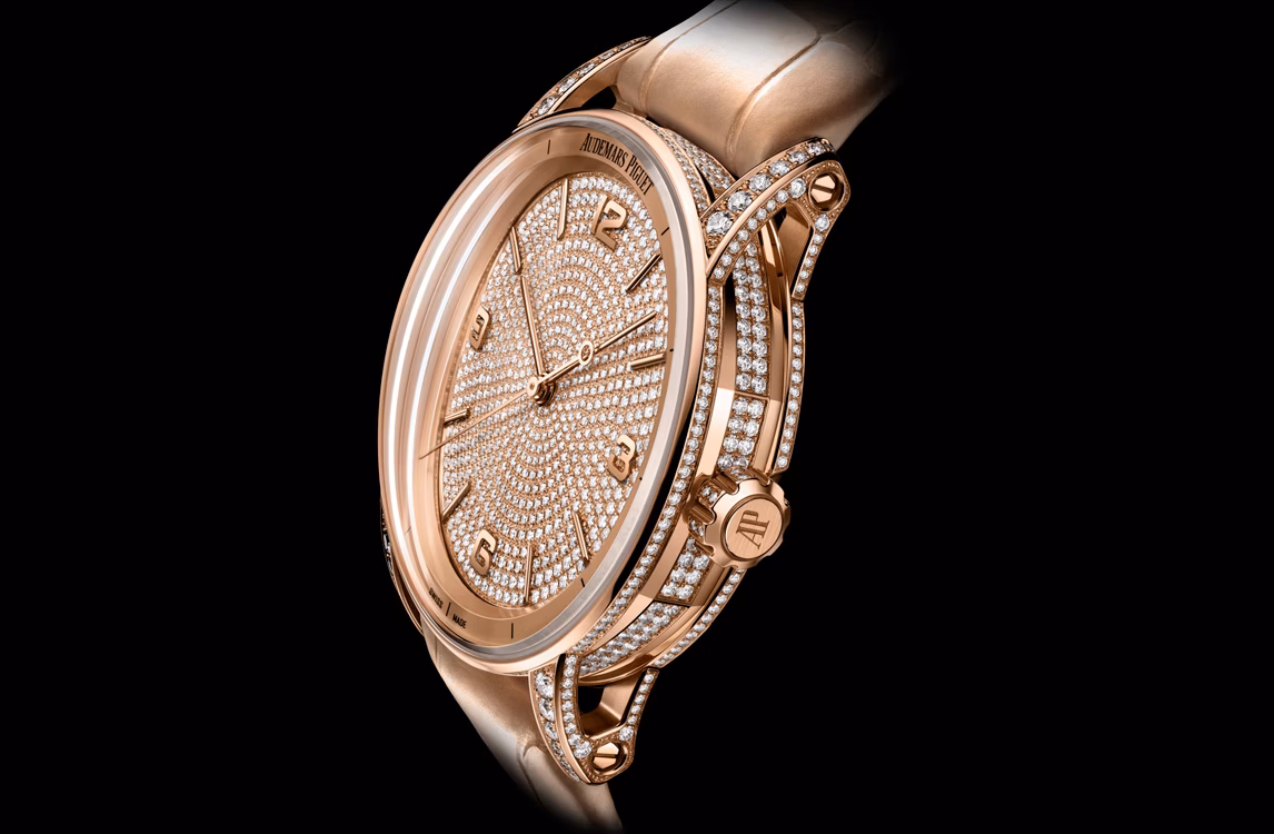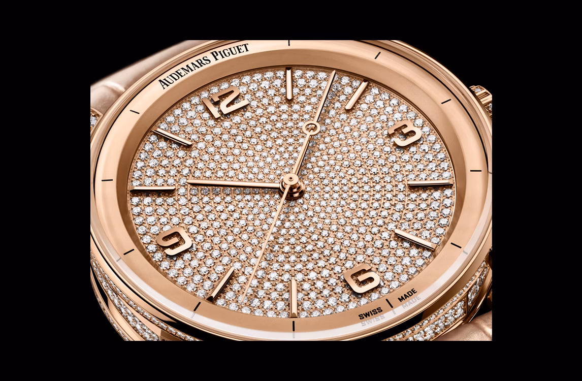 18-carat pink gold dial set with brilliant-cut diamonds, pink gold applied hour-markers and hands, pink gold-toned inner bezel.