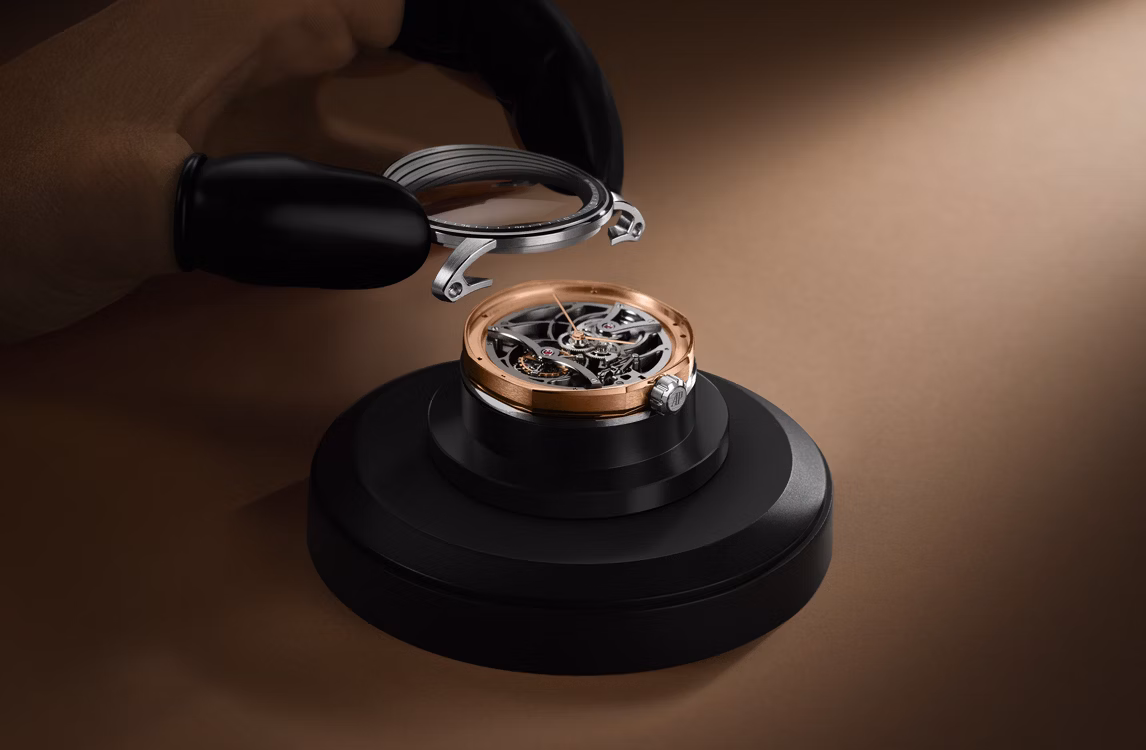 The hand-finished tourbillon openworked movement adorning different shades of grey is housed in a two-tone case interweaving 18-carat white and pink gold, highlighting the watch’s multifaceted geometry.