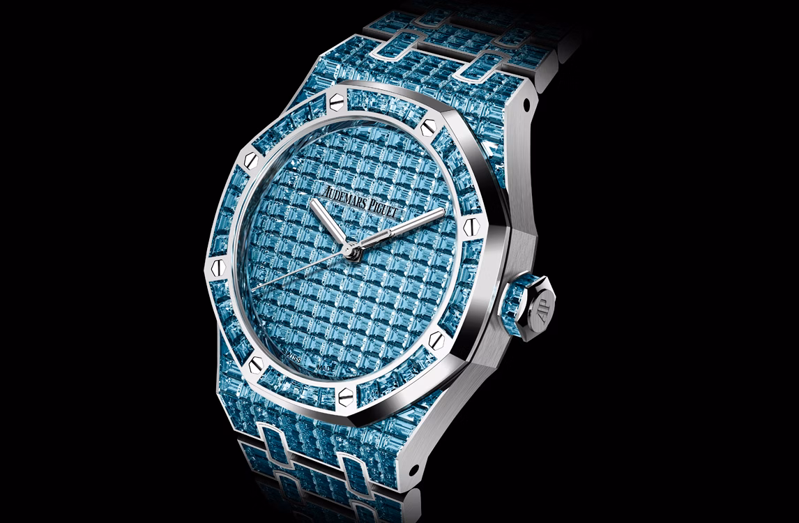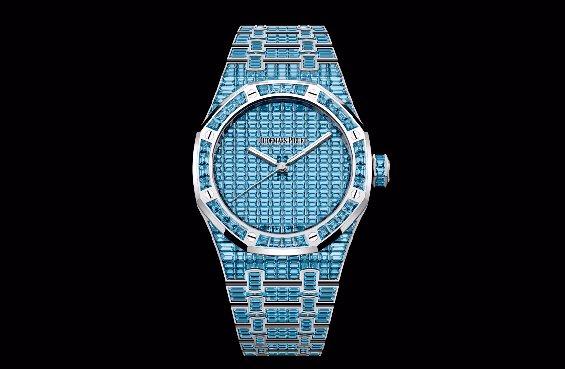 This piece is part of a set of ten pieces, each decorated with a different gemstone. This refined 41 mm Royal Oak Selfwinding displays 861 baguette-cut blue topaz (~41.3 carats) which enhance the case and bracelet's subtle design evolution. The watch also encompasses the dedicated "50-years" oscillating weight.