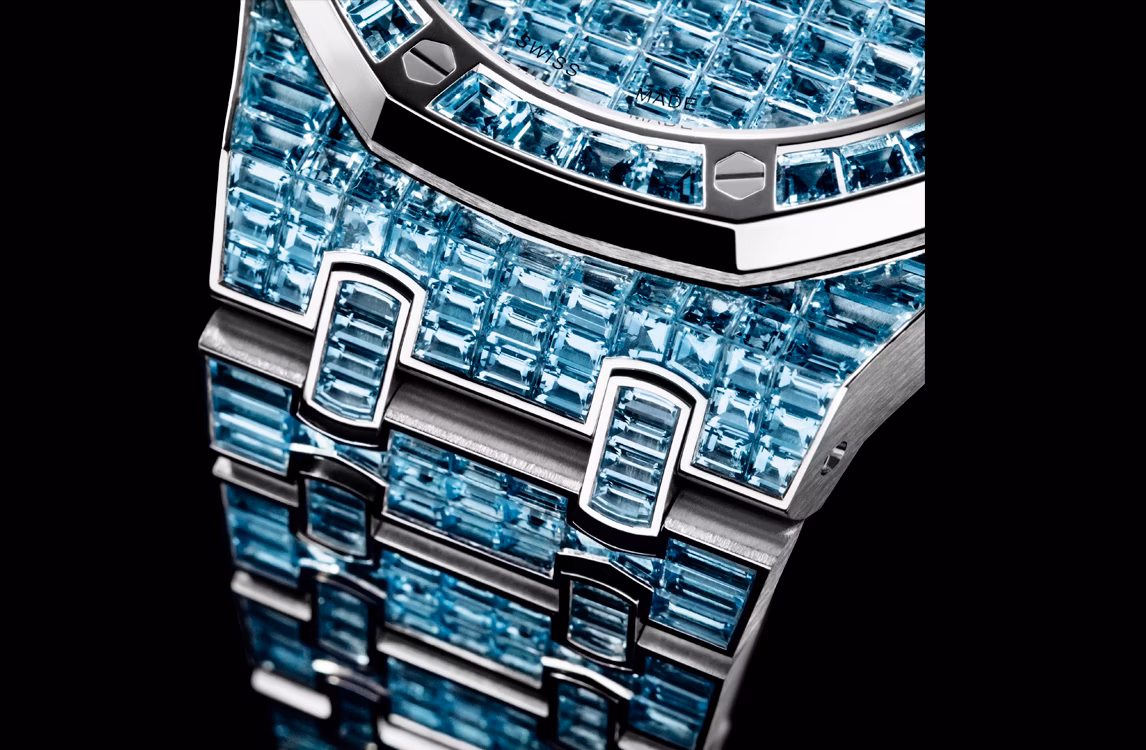 18-carat white gold dial set with baguette-cut blue topaz, white gold Royal Oak hands with luminescent coating.