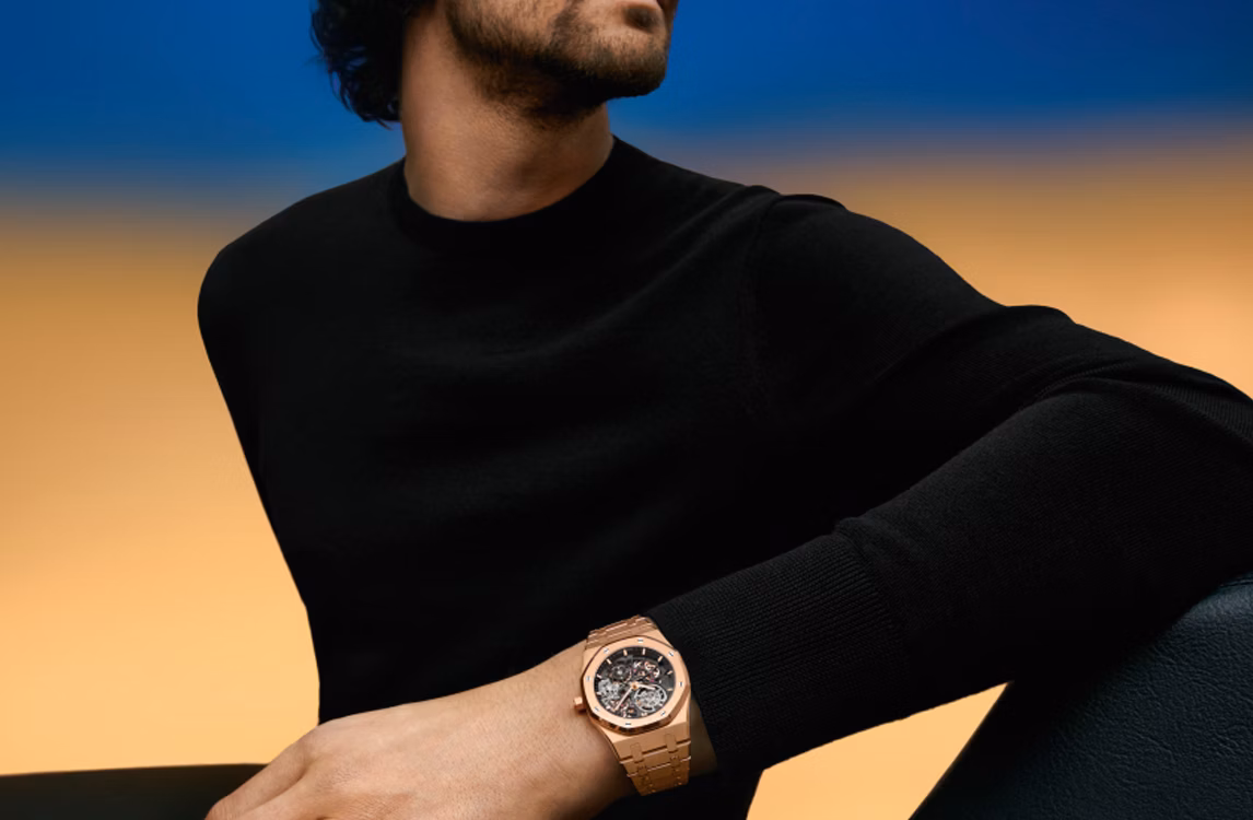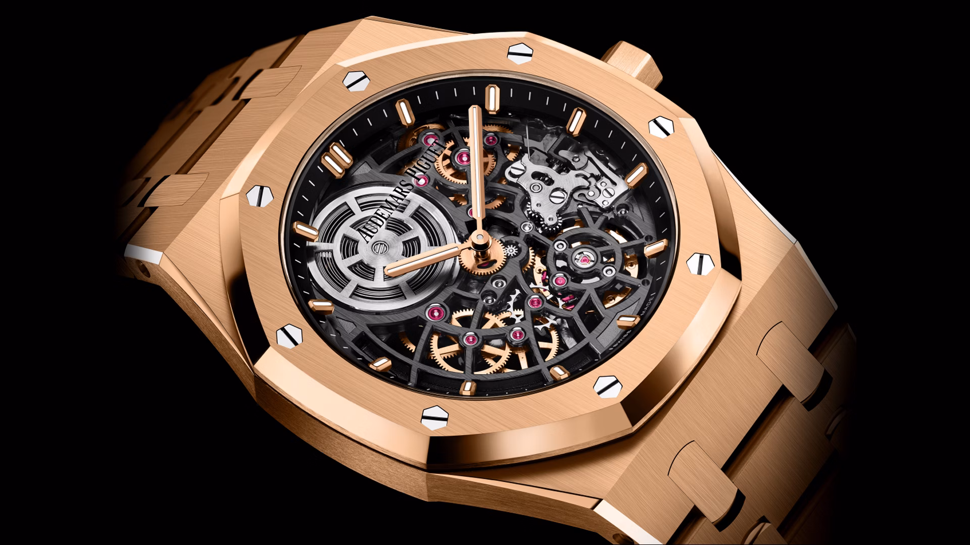 Openworked slate grey dial, pink gold applied hour-markers and Royal Oak hands with luminescent coating.