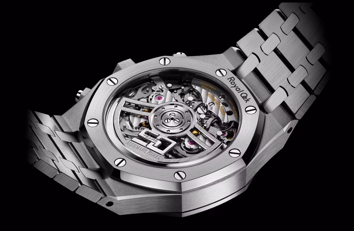 “Bleu nuit nuage 50” dial with “Grande Tapisserie” pattern, “Bleu nuit nuage 50” counters, white gold applied hour-markers and Royal Oak hands with luminescent coating.
