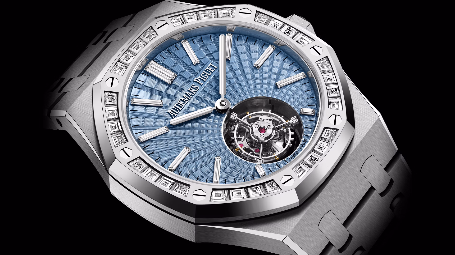 This Royal Oak Selfwinding Flying Tourbillon is fully crafted in 950 platinum and enhanced with a light blue sunburst Tapisserie dial and a bezel set with baguette-cut diamonds.