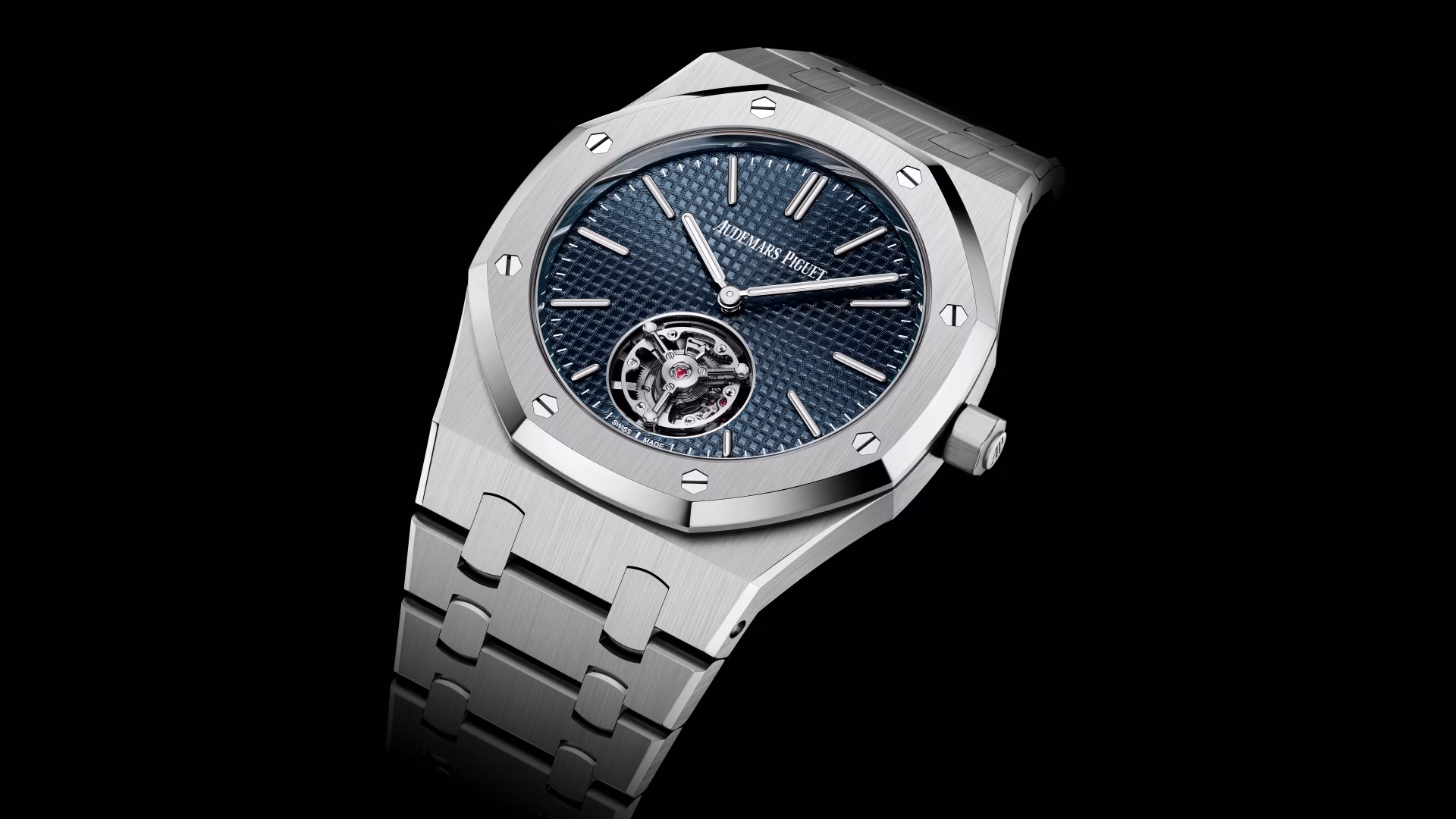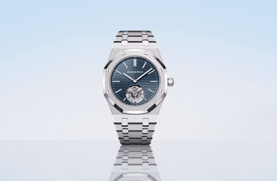 Blue dial with “Petite Tapisserie” pattern, white gold hour-markers and Royal Oak hands with luminescent coating.