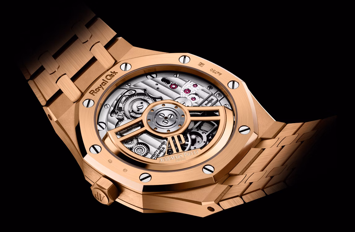 Brown dimpled dial, pink gold applied hour-markers and Royal Oak hands with luminescent coating.