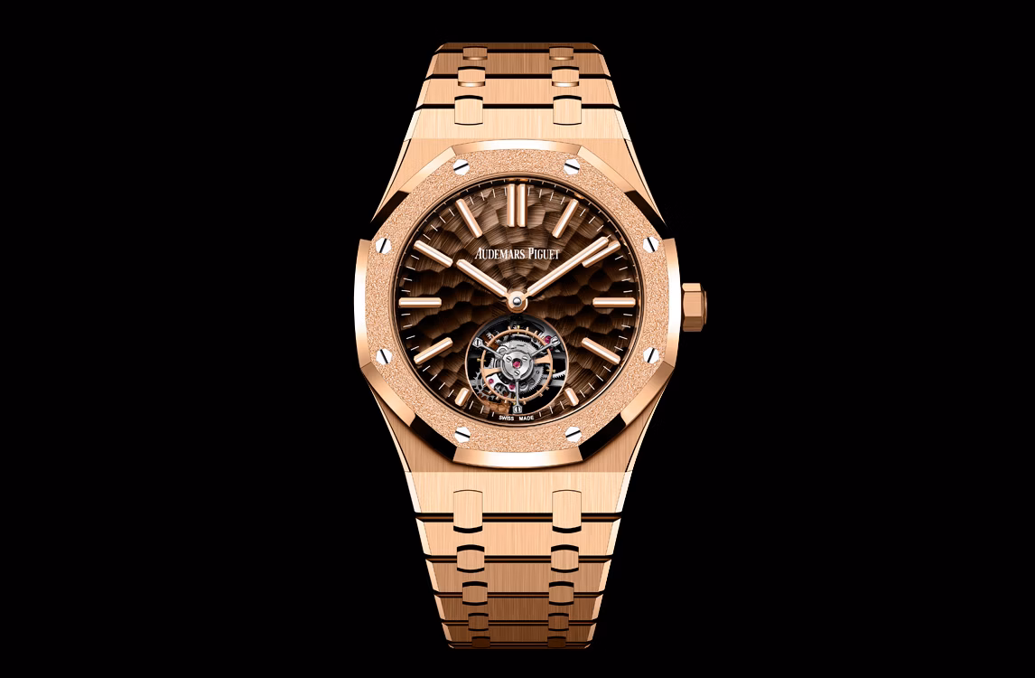 The bezel of this 18-carat pink gold Royal Oak Selfwinding Flying Tourbillon in 41 mm is decorated with Frosted Gold and enhanced with an elegant brown dimpled dial.