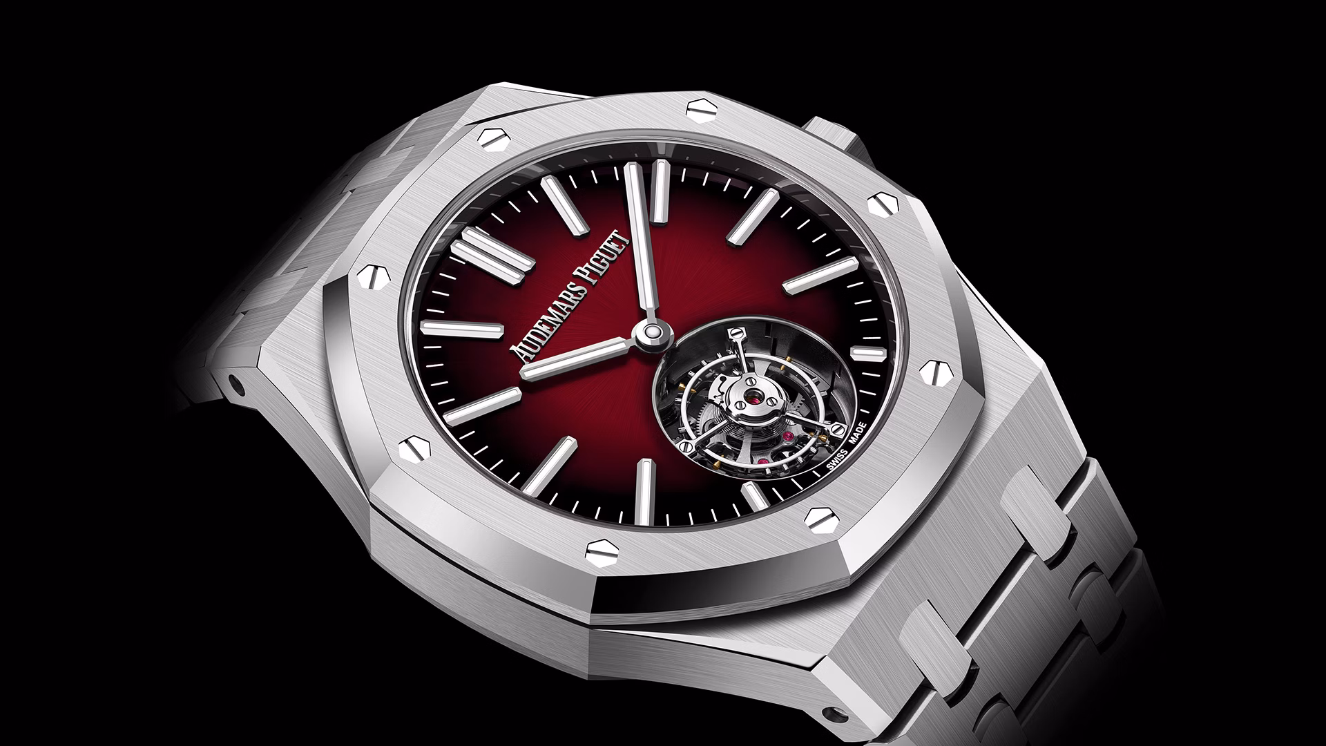 This 41 mm Royal Oak Selfwinding Flying Tourbillon brings together stainless steel with a smoked burgundy dial for a striking contrast.