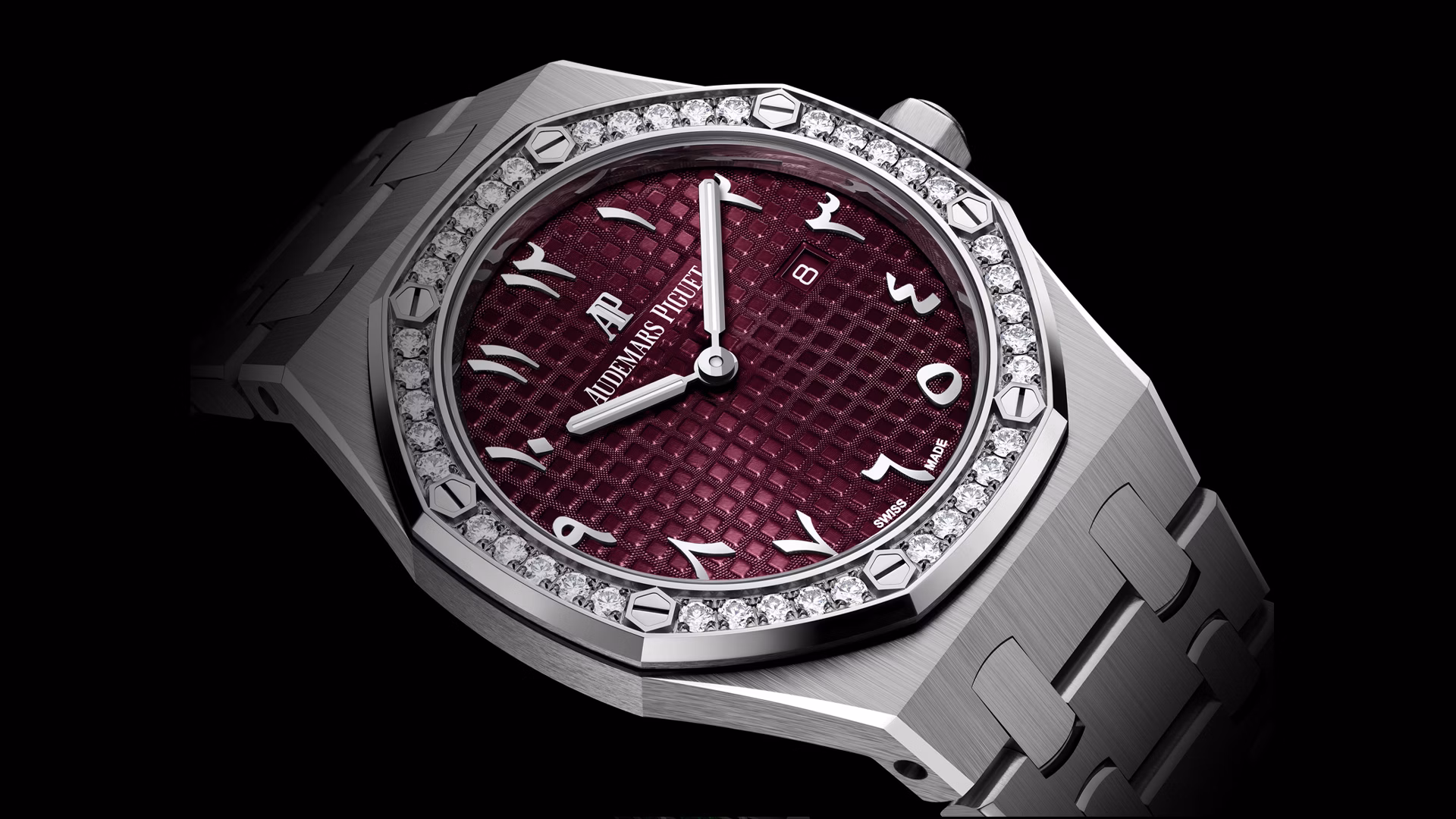 Burgundy dial with “Grande Tapisserie” pattern, special Arabic indexes and Royal Oak hands with luminescent coating.