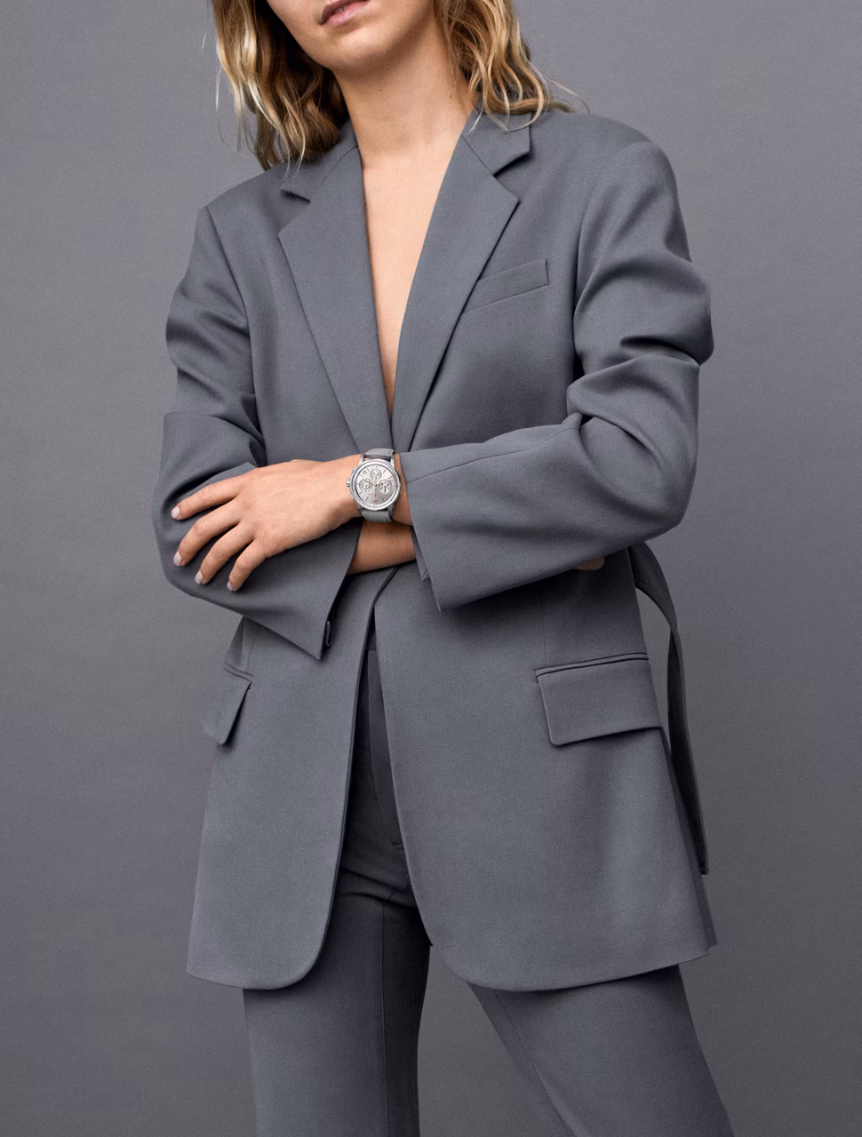 La caja bicolor, con una fusión de oro blanco y rosa de 18 quilates, se complementa con una esfera «rayos de sol» y contadores de cronógrafo lacados en gris. La pulsera con revestimiento de caucho gris pone la guinda al conjunto.