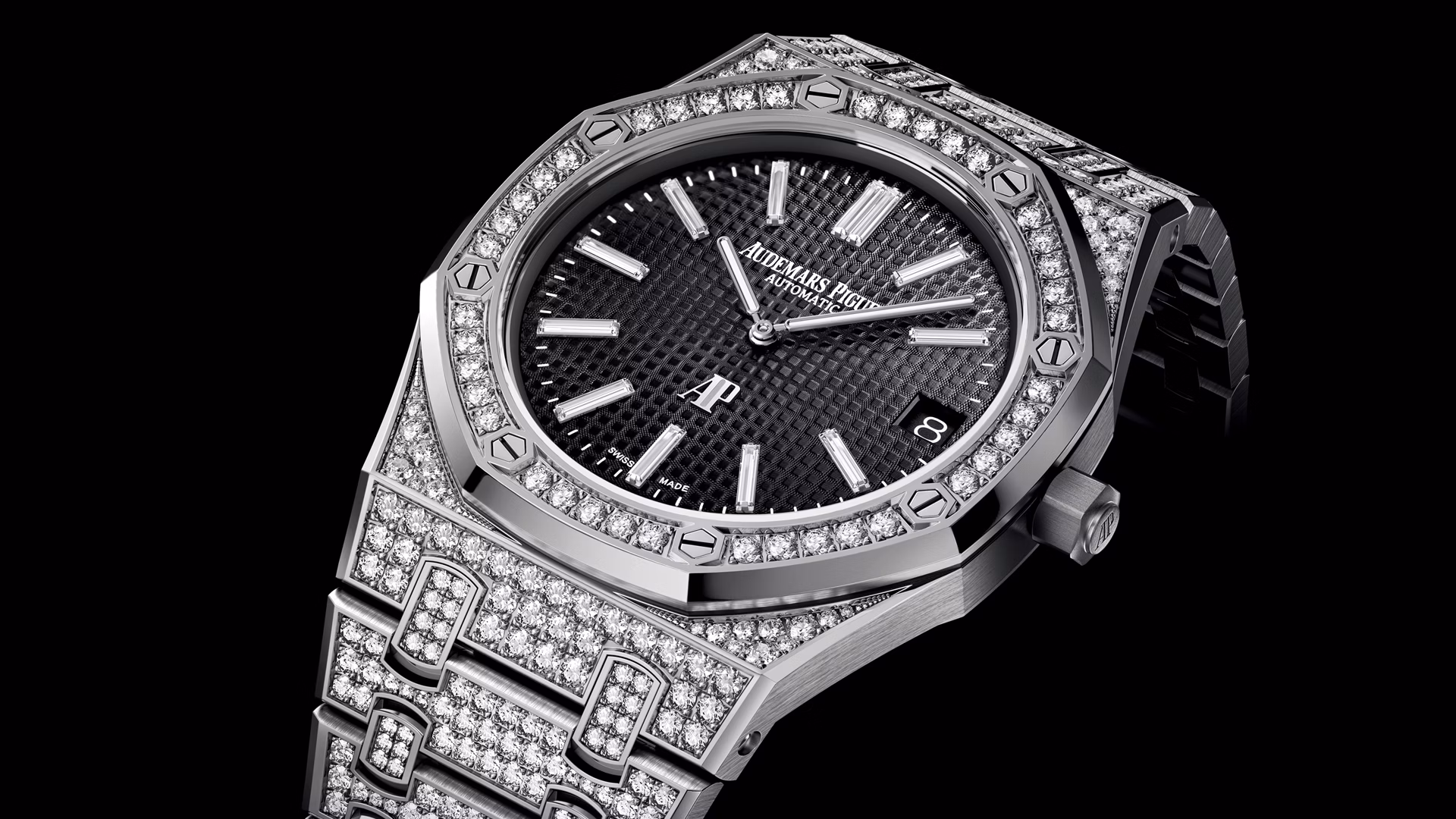 La esfera «Petite Tapisserie» negra de este Royal Oak «Jumbo» contrasta con una caja y un brazalete de oro blanco de 18 quilates engastados íntegramente con 1.102 diamantes de talla brillante.