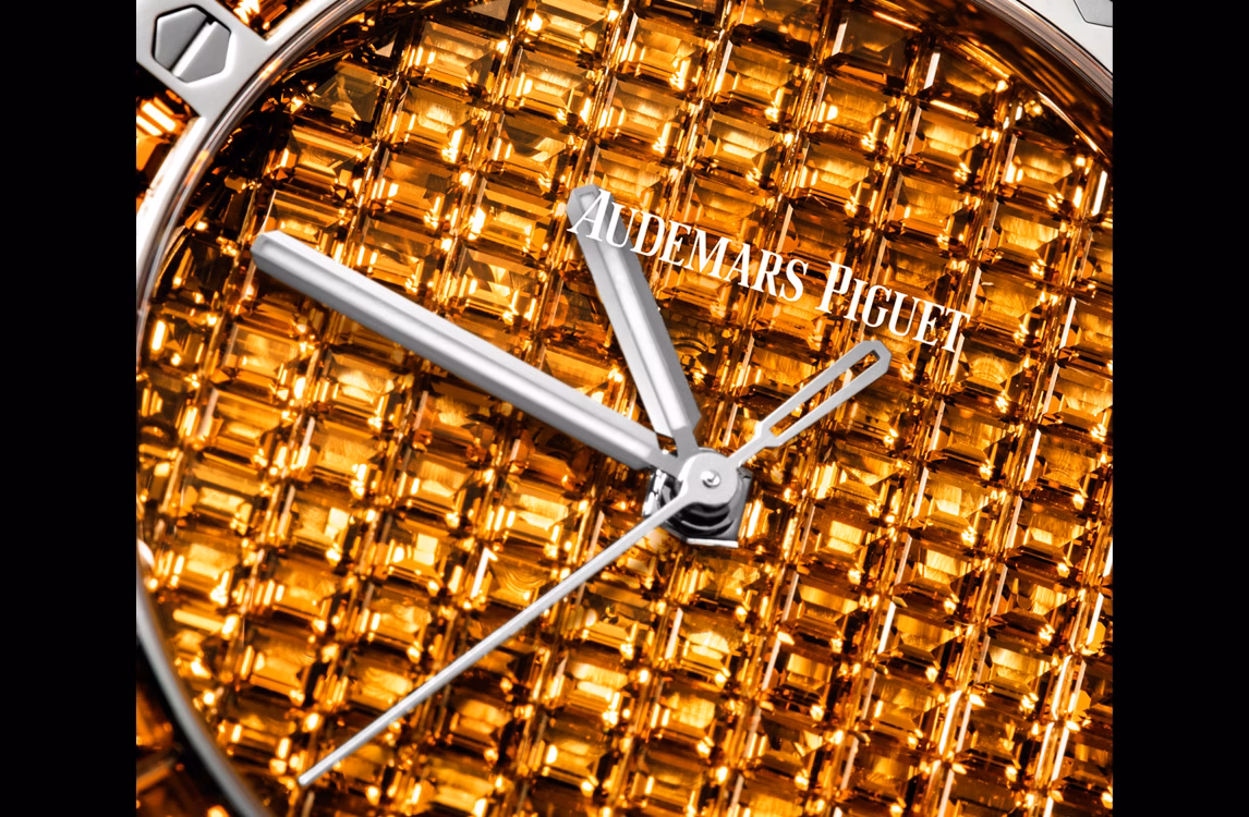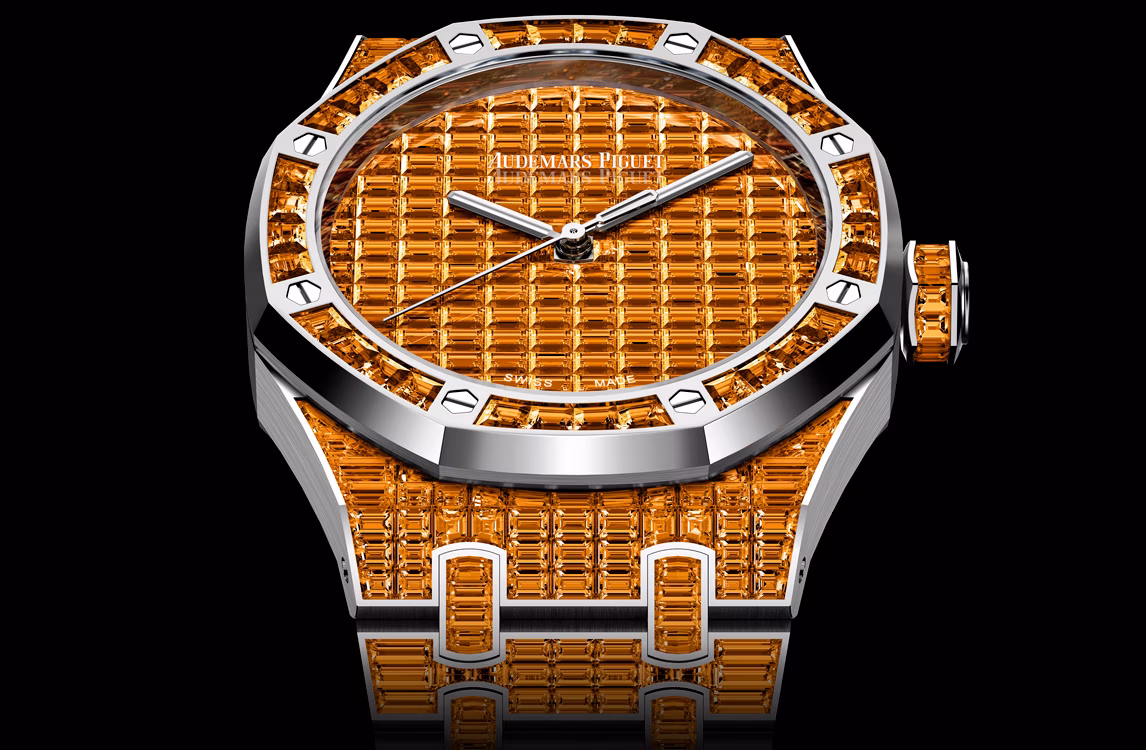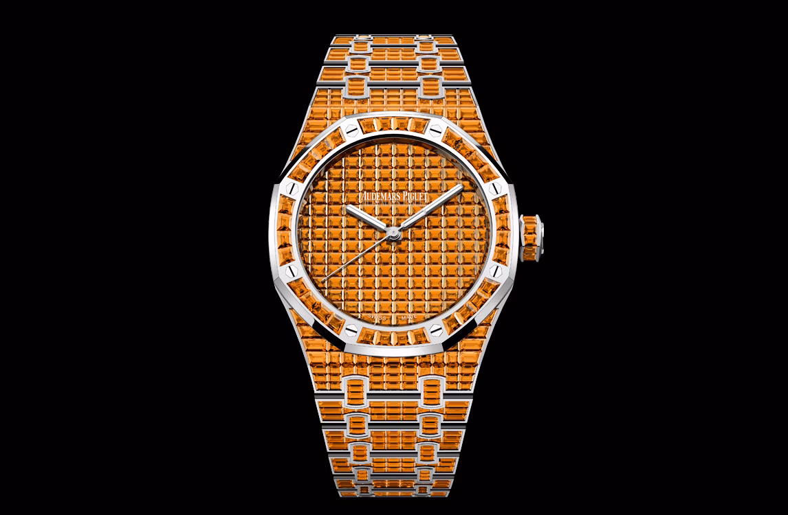 Esta creación forma parte de un conjunto de diez piezas, cada una de ellas decorada con una gema diferente. Este Royal Oak Automático de oro blanco de 41 mm brilla bajo el fulgor de 861 espesartinas naranjas de talla baguette (~47,3 quilates). Incluye asimismo la nueva evolución de diseño de la caja y el brazalete del Royal Oak, así como la masa oscilante «50 aniversario» específica.