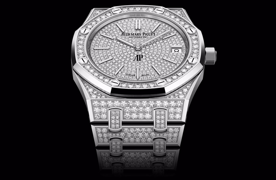 Los diamantes ocupan un lugar central en este Royal Oak «Jumbo» totalmente engastado que brinda al reloj un flujo de brillo constante e impecable desde la esfera hasta el brazalete.