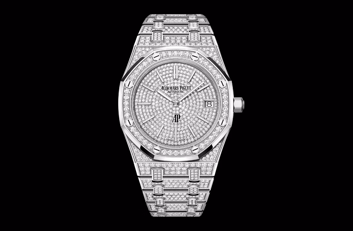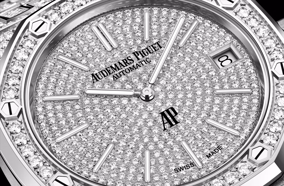 Esfera de oro blanco de 18 quilates, engastada con diamantes de talla brillante, índices aplicados de oro blanco, agujas Royal Oak de oro blanco con revestimiento luminiscente.