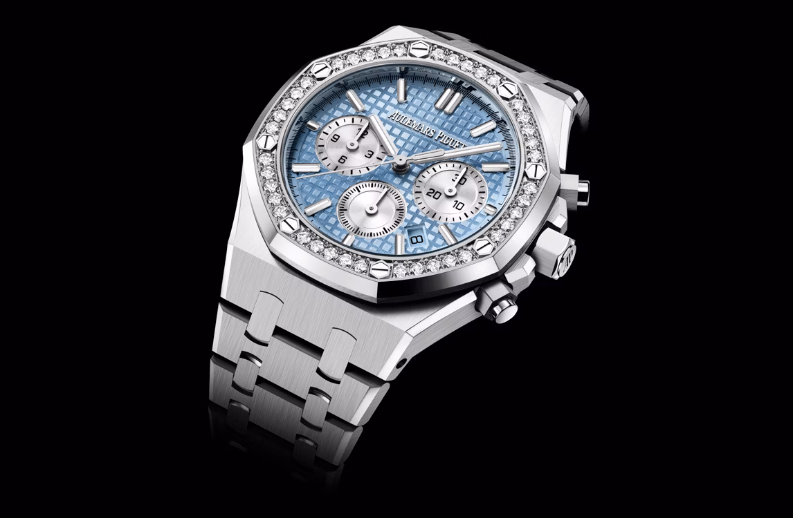 Este cronógrafo de 38 mm combina con elegancia el acero inoxidable con una esfera «Grande Tapisserie» azul claro realzada mediante un bisel engastado con diamantes y contadores plateados. La nueva evolución del diseño Royal Oak brinda al reloj una estética más esbelta.