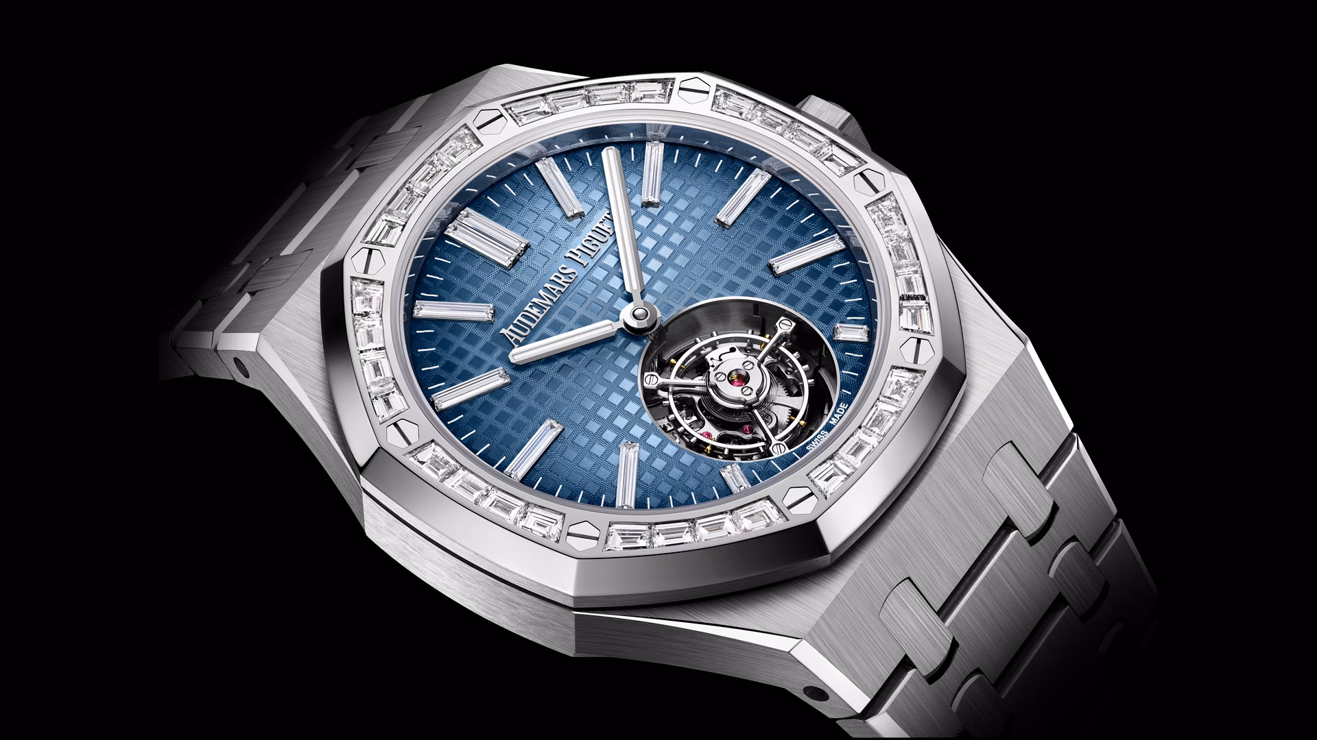 Esfera azul ahumado con motivos «Grande Tapisserie», índices aplicados con diamantes de talla baguette, agujas Royal Oak con revestimiento luminiscente.