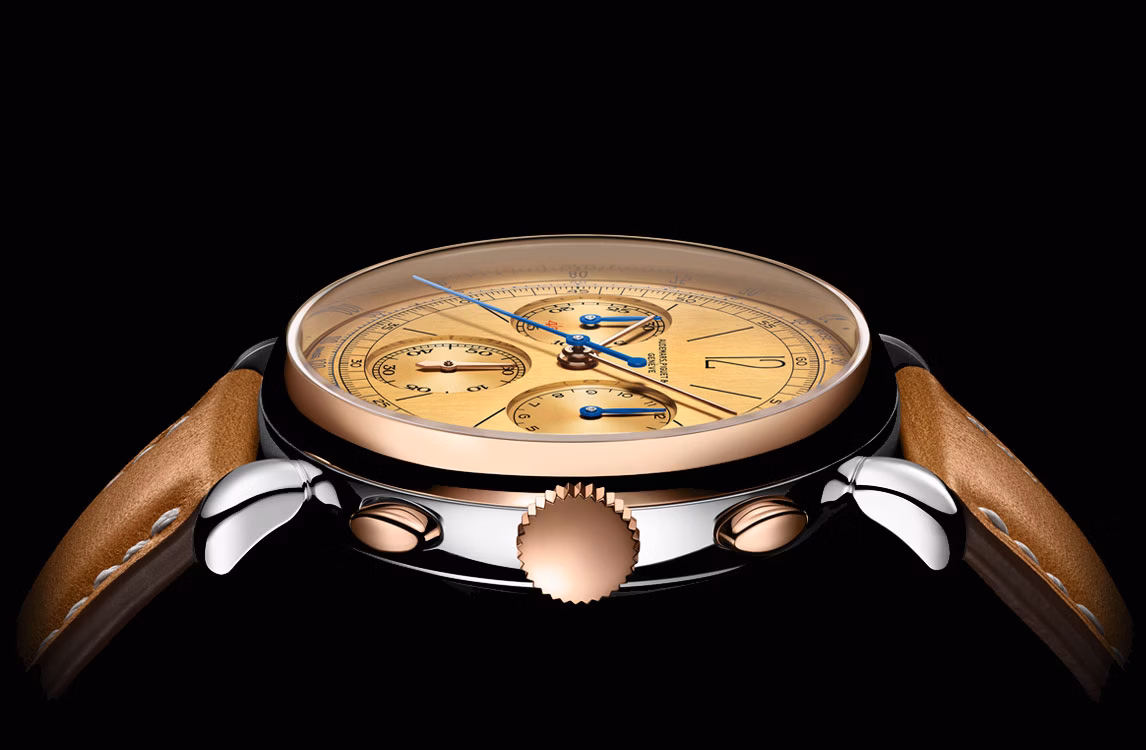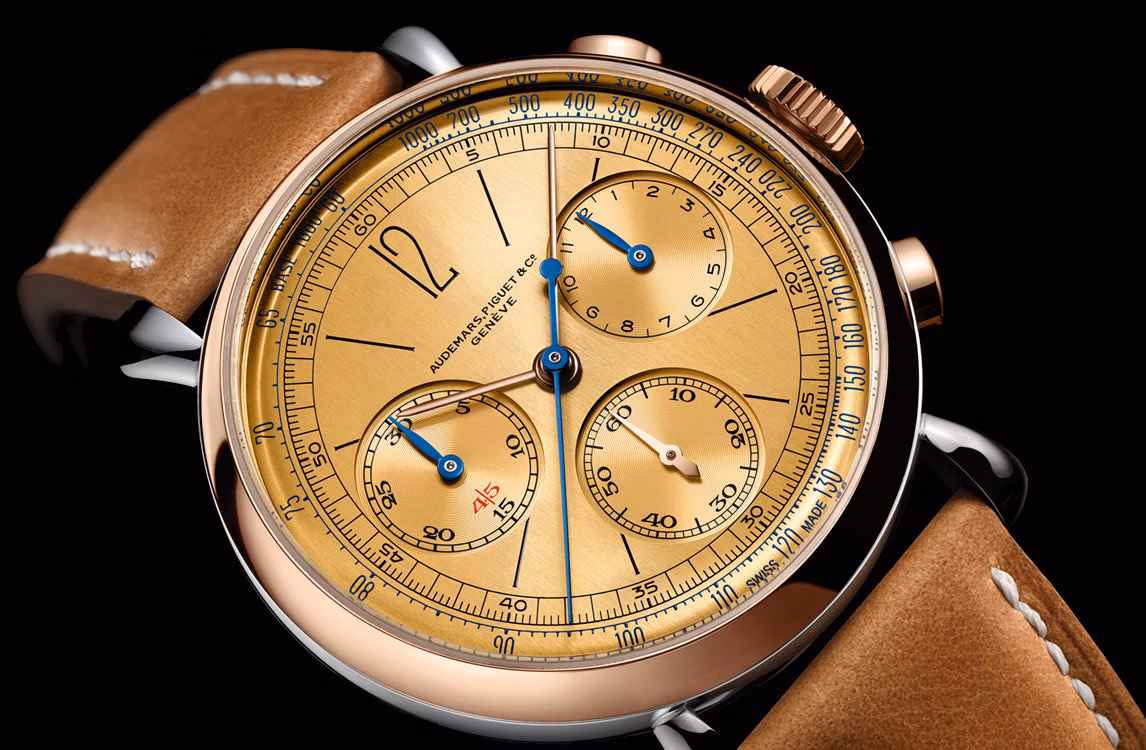 Cadran couleur or jaune, échelle tachymétrique bleue, aiguilles en or rose avec l'aiguille de seconde chrono bleue.
