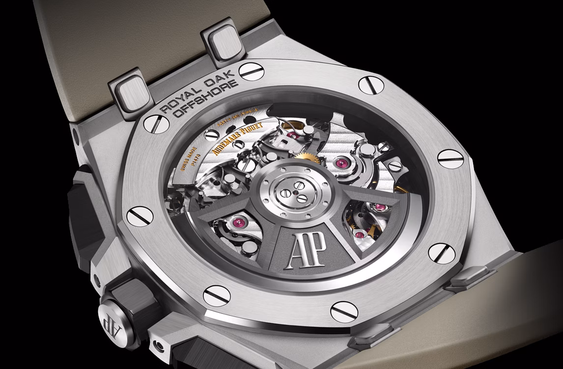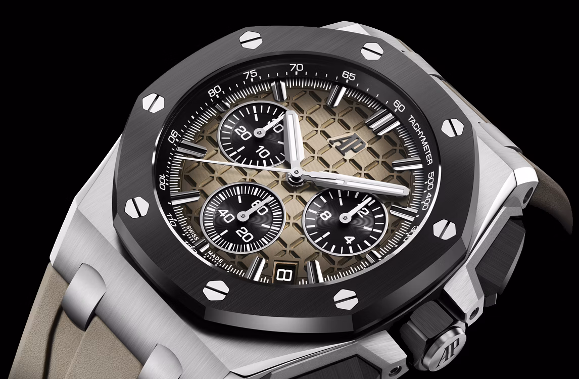 Cadran brun clair fumé avec motif « Méga Tapisserie », compteurs noirs, zone extérieure noire, index appliqués en or gris, aiguilles Royal Oak en or gris avec dépôt luminescent, réhaut noir