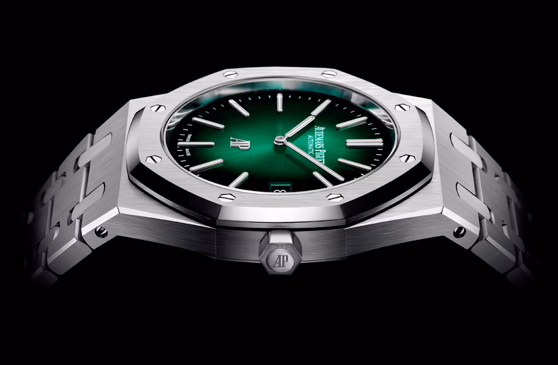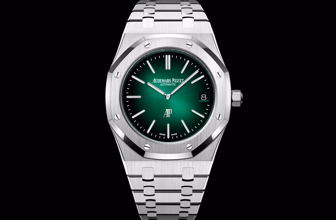 Cette Royal Oak "Jumbo" Extra-Plate en platine 950 arbore un cadran soleillé fumé d’un vert intense pour accentuer les contrastes.