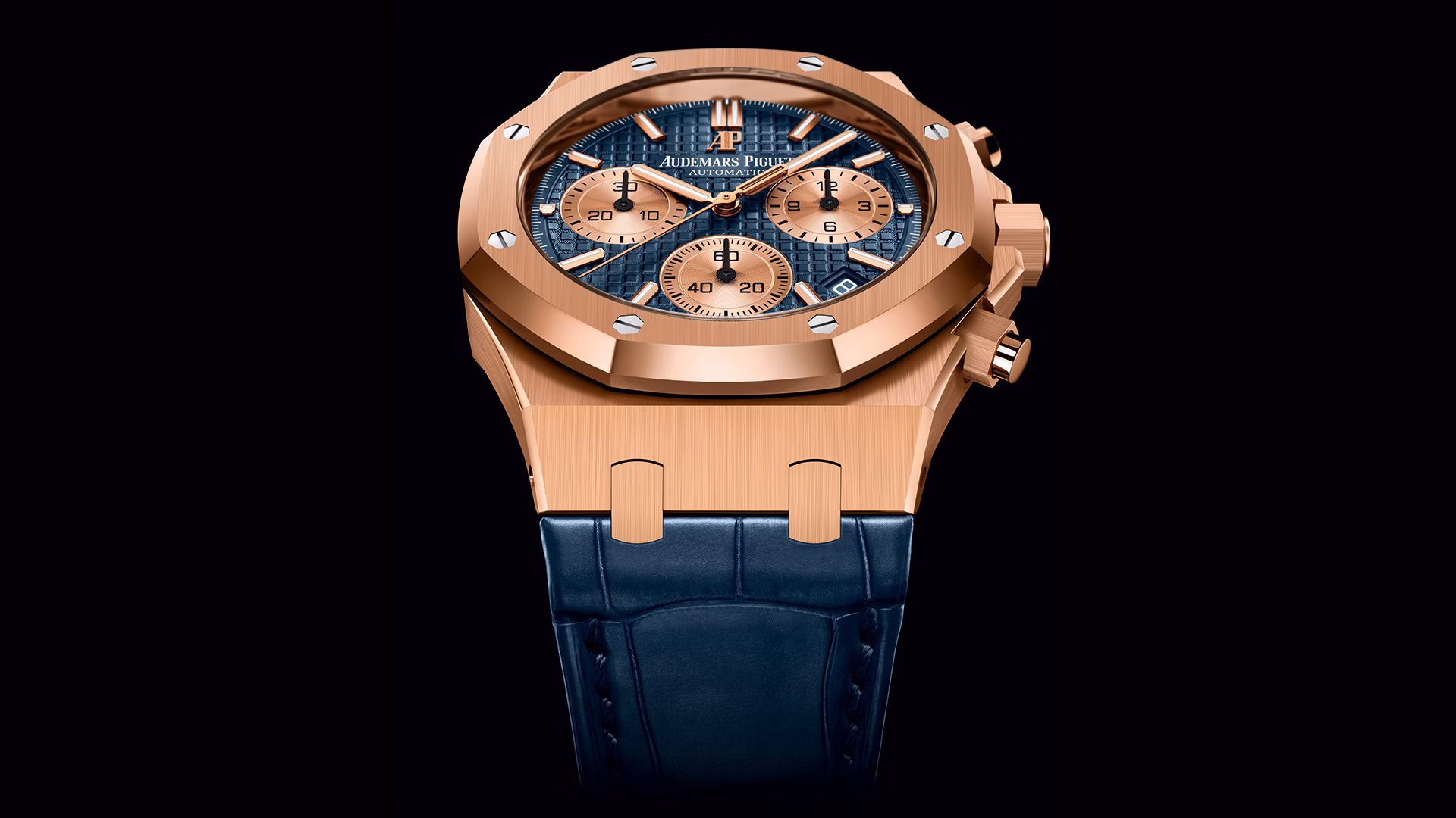 Cette boîte en or rose 18 carats, agrémentée d’un cadran bleu « Grande Tapisserie » et d’un bracelet en alligator assorti, sert d'écrin au dernier chronographe Manufacture doté de la fonction retour en vol, Calibre 4401.