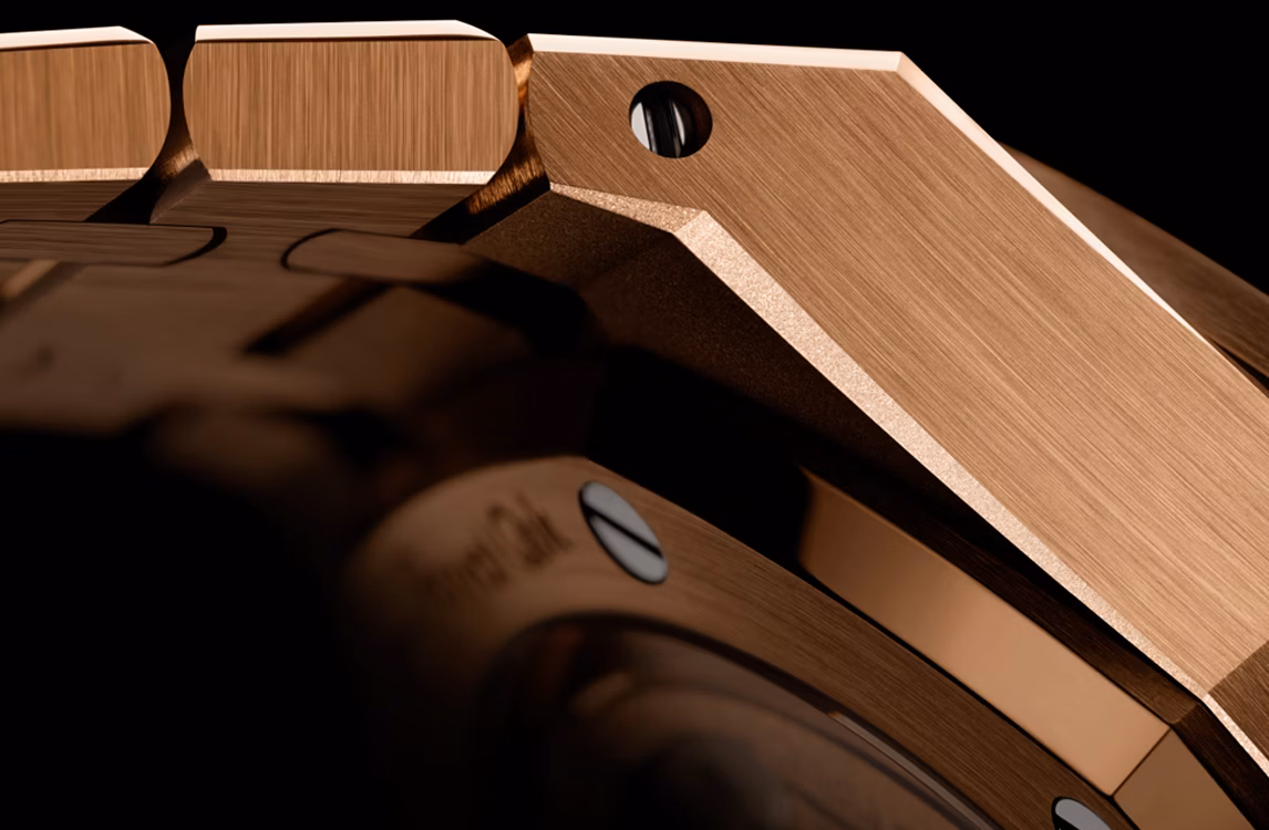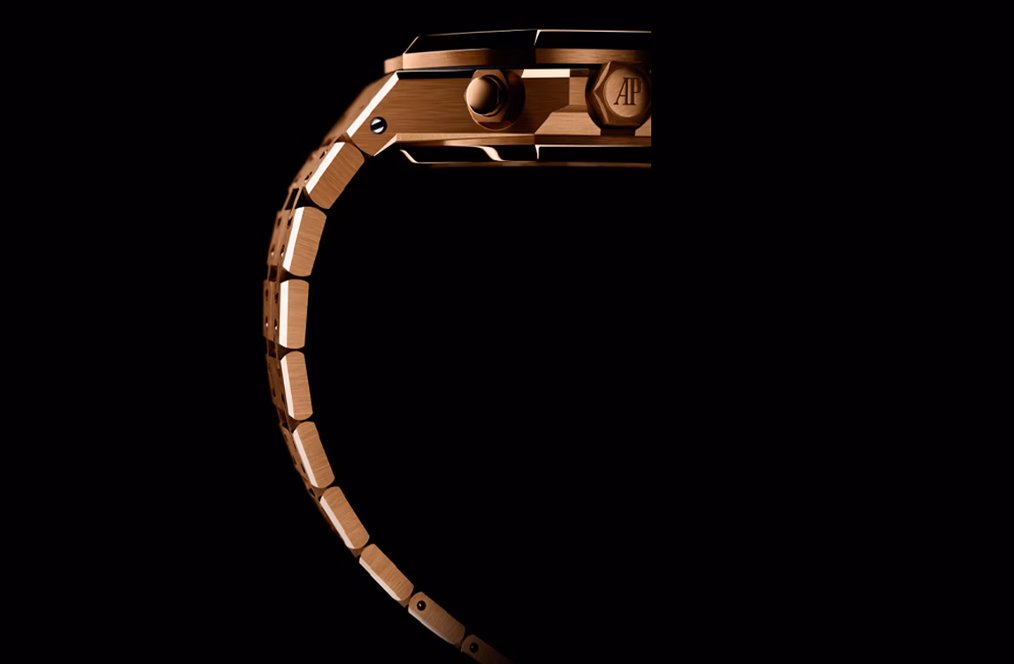 Le cadran « Grande Tapisserie » de teinte Bleu Nuit, Nuage 50 apporte un élégant contraste avec la boîte et le bracelet en or rose 18 carats. Ce Chronographe 41 mm intègre également la nouvelle évolution esthétique de la Royal Oak ainsi que la masse oscillante spéciale « 50 ans ».