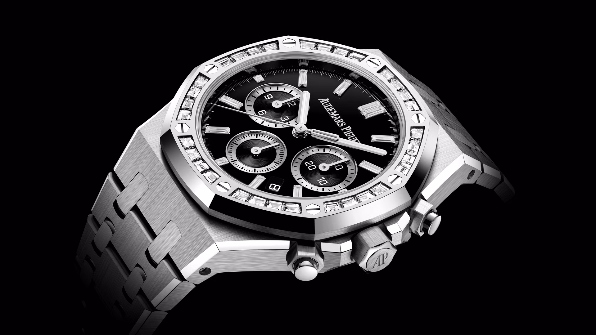 Onyx et diamants taille baguette ornent ce nouveau modèle en or gris, alliant le caractère sportif de la Royal Oak Chronographe Automatique à des matériaux précieux.