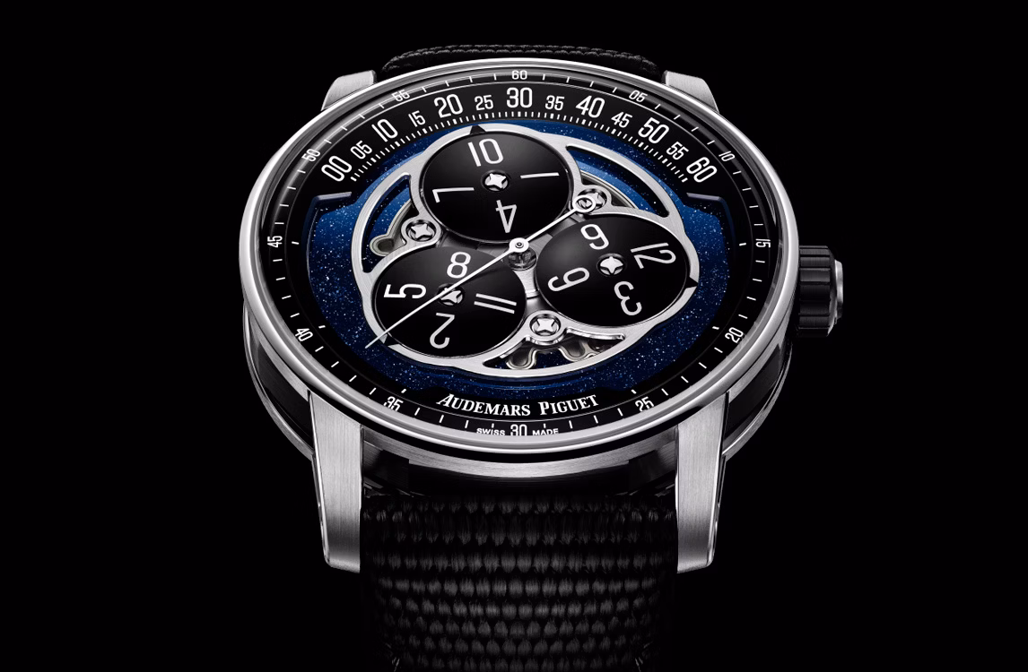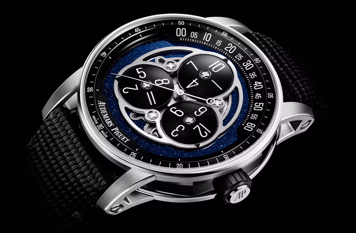 Il Code 11.59 by Audemars Piguet Starwheel propone una versione contemporanea della complicazione delle ore erranti. La cassa bicolore abbina la ceramica nera all'oro bianco, mentre il quadrante in avventurina blu funge da sfondo ai tre dischi delle ore erranti in alluminio rivestito in PVD nero che ruotano al centro.