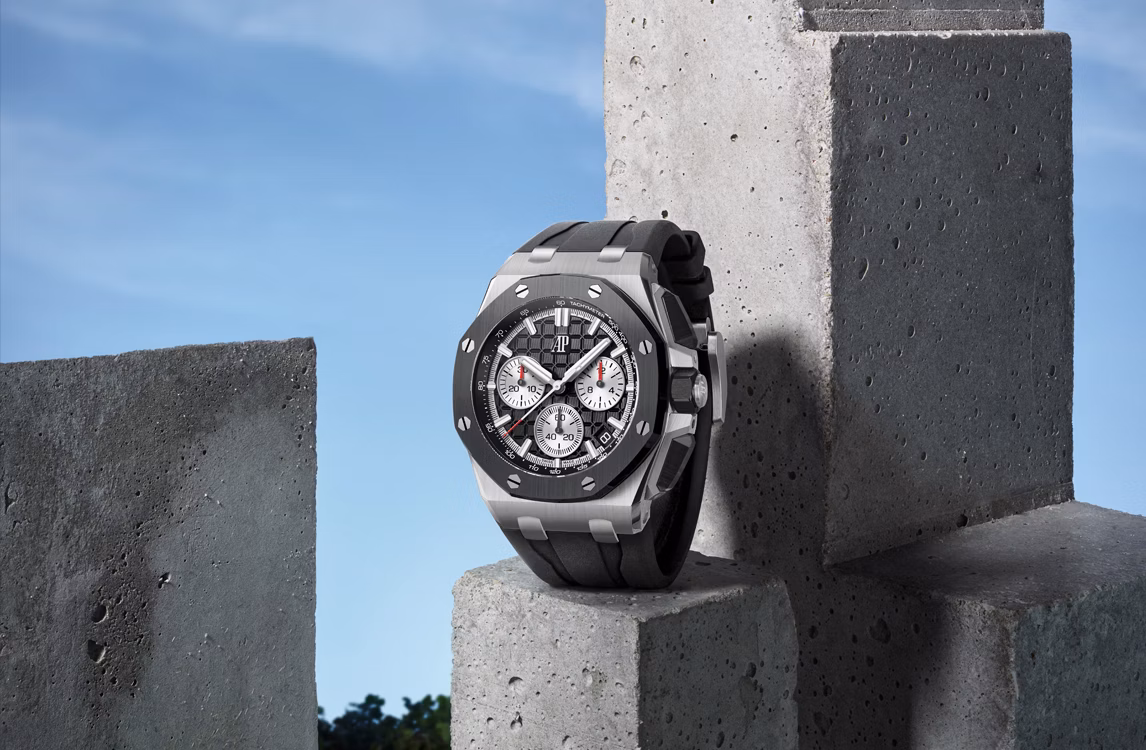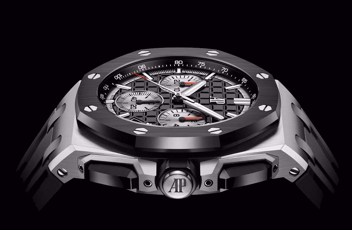 Black dial with “Méga Tapisserie” pattern, rhodium-toned counters and external zone, white gold applied hour-markers and Royal Oak hands with luminescent coating, black inner bezel