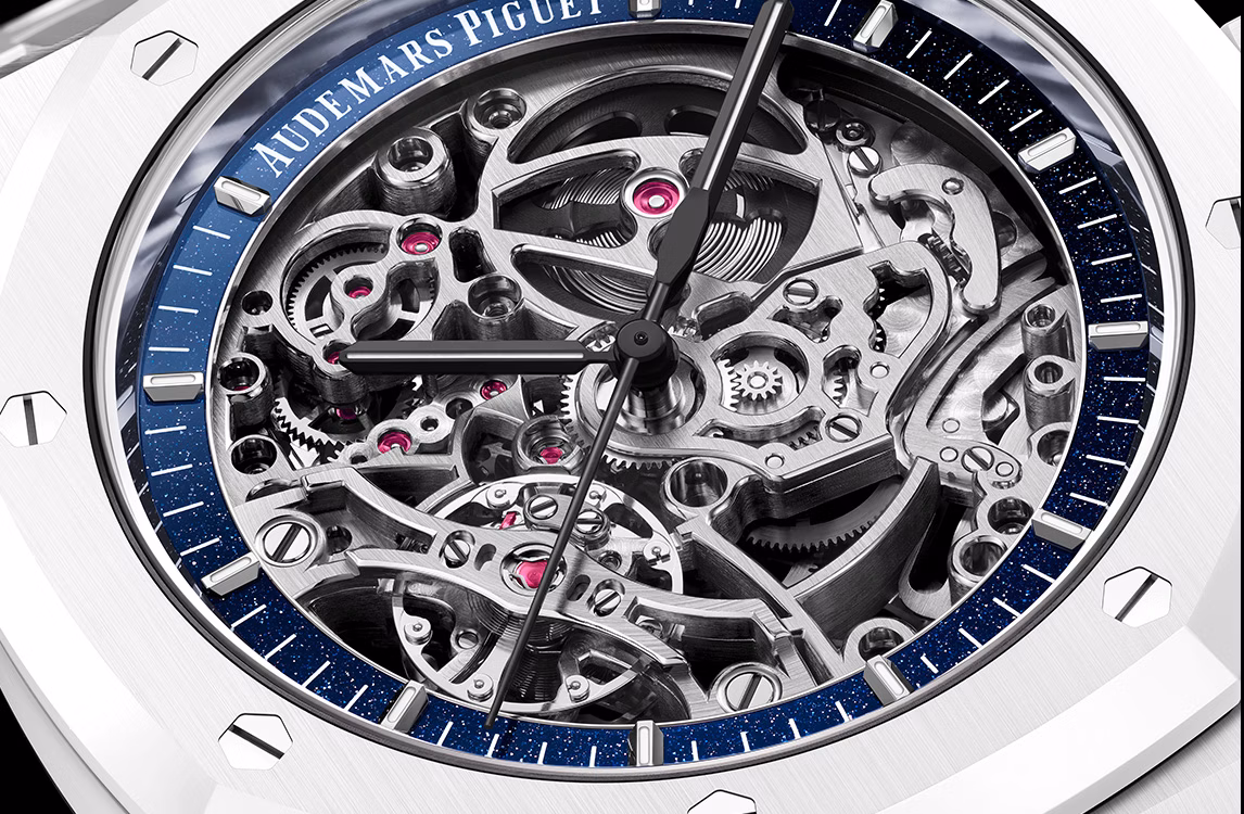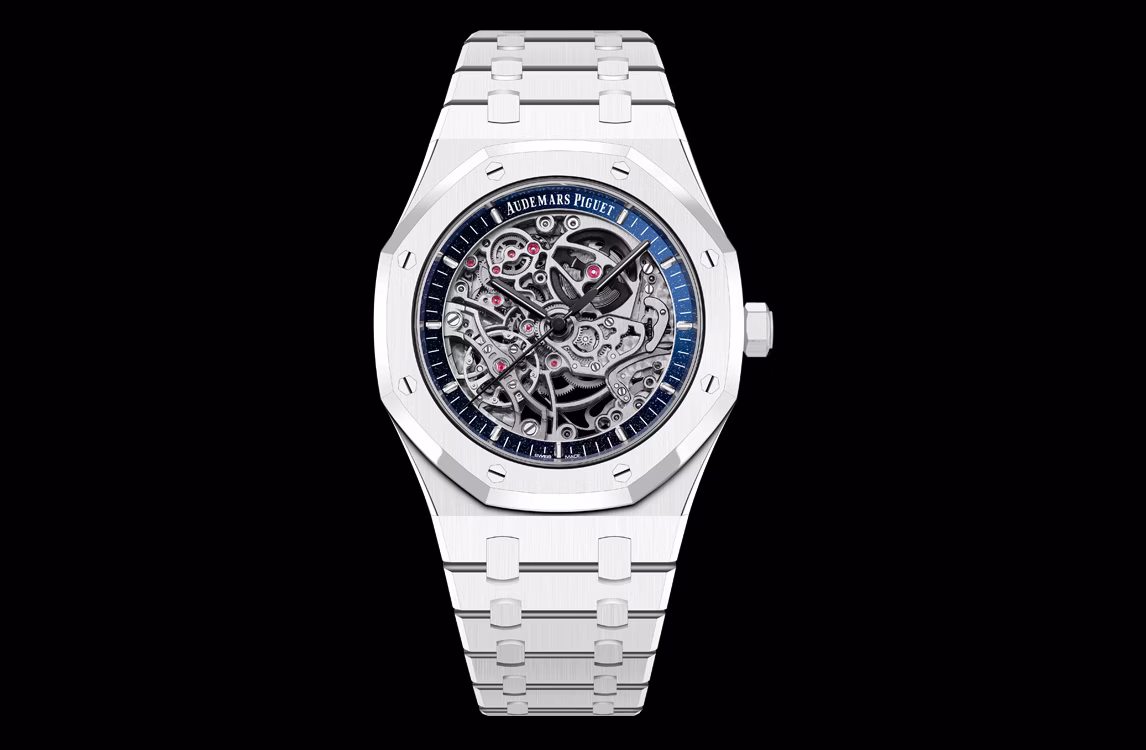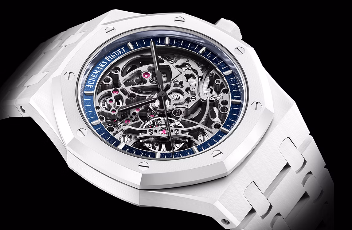 La cassa e il bracciale in ceramica bianca sono impreziositi da un réhaut in avventurina blu che incornicia elegantemente il movimento scheletrato color rodio. Le lancette brunite del Royal Oak e gli indici in oro bianco esaltano l'estetica a contrasto di questo segnatempo.