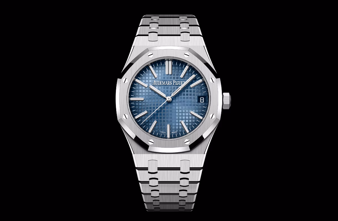Firma di Audemars Piguet, il quadrante con motivo "Grande Tapisserie" è al centro dell’attenzione in questo modello in oro bianco da 41 mm, interpretato in una nuova tonalità blu fumé che ne esalta il motivo.
