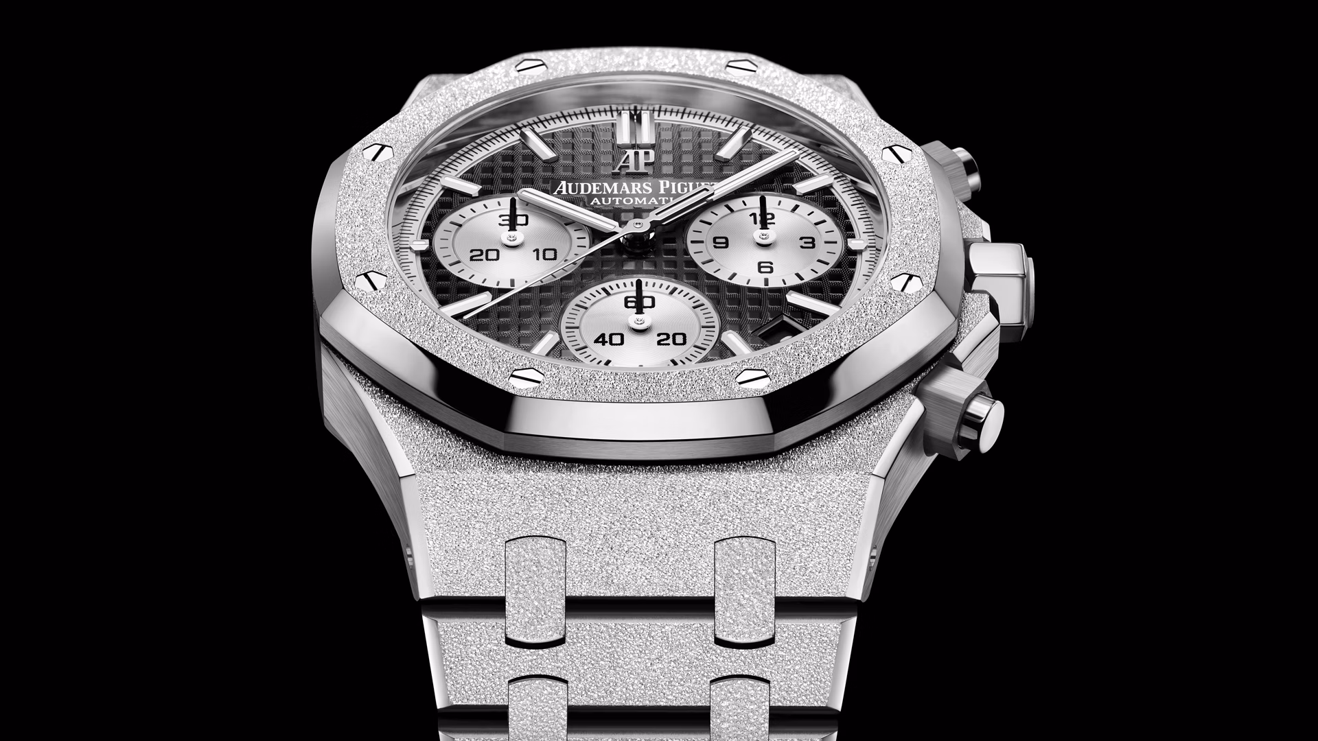 Quadrante nero con motivo "Grande Tapisserie", contatori rodiati, indici applicati e lancette Royal Oak in oro bianco con rivestimento luminescente.