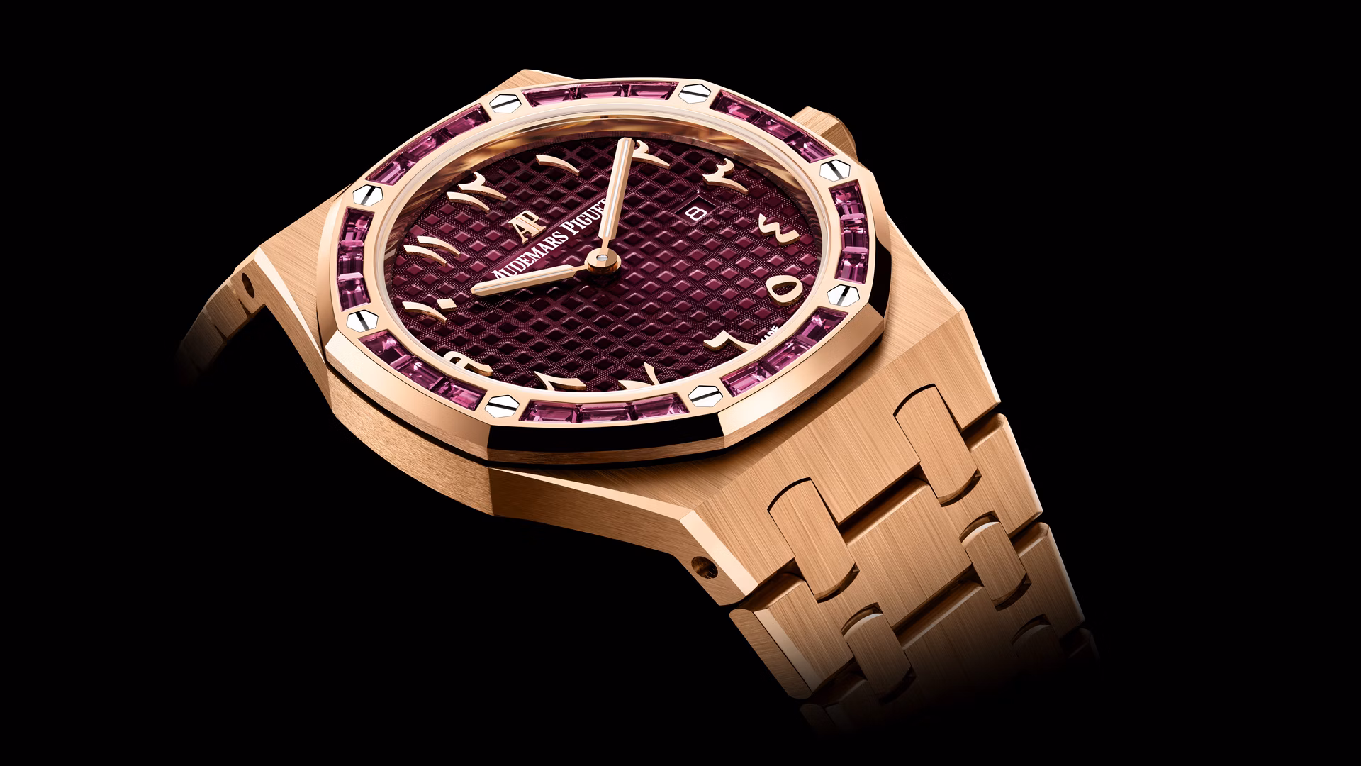 Quadrante bordeaux con motivo “Grande Tapisserie”, indici in numeri arabi orientali applicati e lancette Royal Oak in oro rosa con rivestimento luminescente.