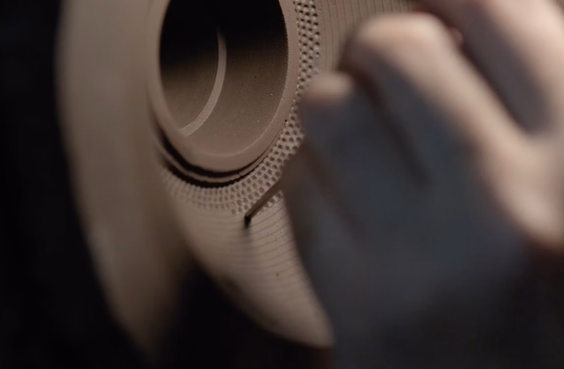 「南部鉄器は鋳造でつくります。まず砂型をつくって、そこに溶解した鉄を流し込んで自由なかたちをつくる技法です。木型は設計図のようなもので、つくりたいかたちの半分だけが鉄板に刻まれています。この木型を上下で固定して回転させながら、特殊な鋳物用の砂を振りかけていくと、ひとつの完全なかたちの砂型が出来上がります。ここでかたちの精度が決まるため、とても重要な工程です」