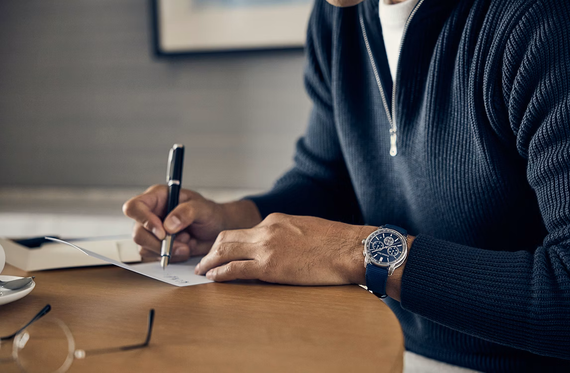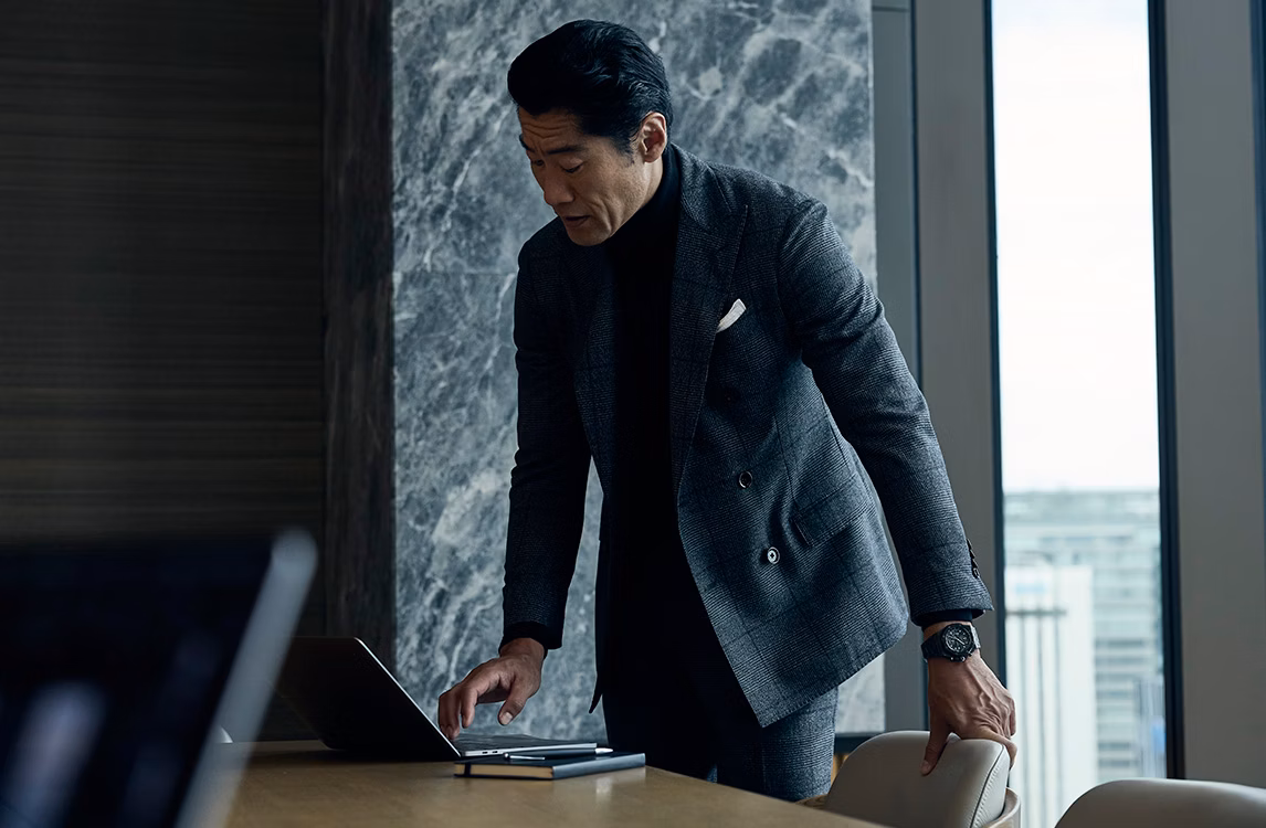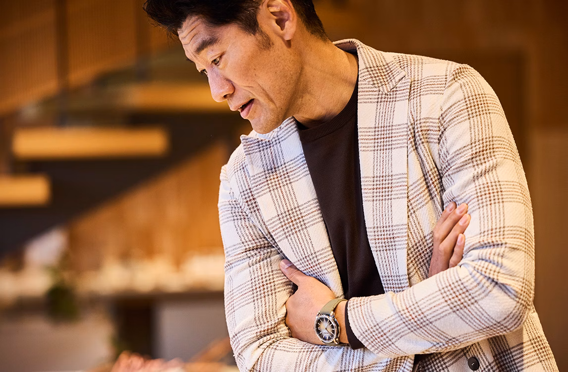 ダブルブレストのグレースーツを纏った正統派のタイドアップスタイルも小物使いで刷新。ラバーストラップで程よくカジュアルダウンしたCODE 11.59は、グレーとも相性のよい「ナイトブルー、クラウド50」カラーのダイヤルの一本を。ネクタイ、シューズも遊び心あるアイテムをプラスして。