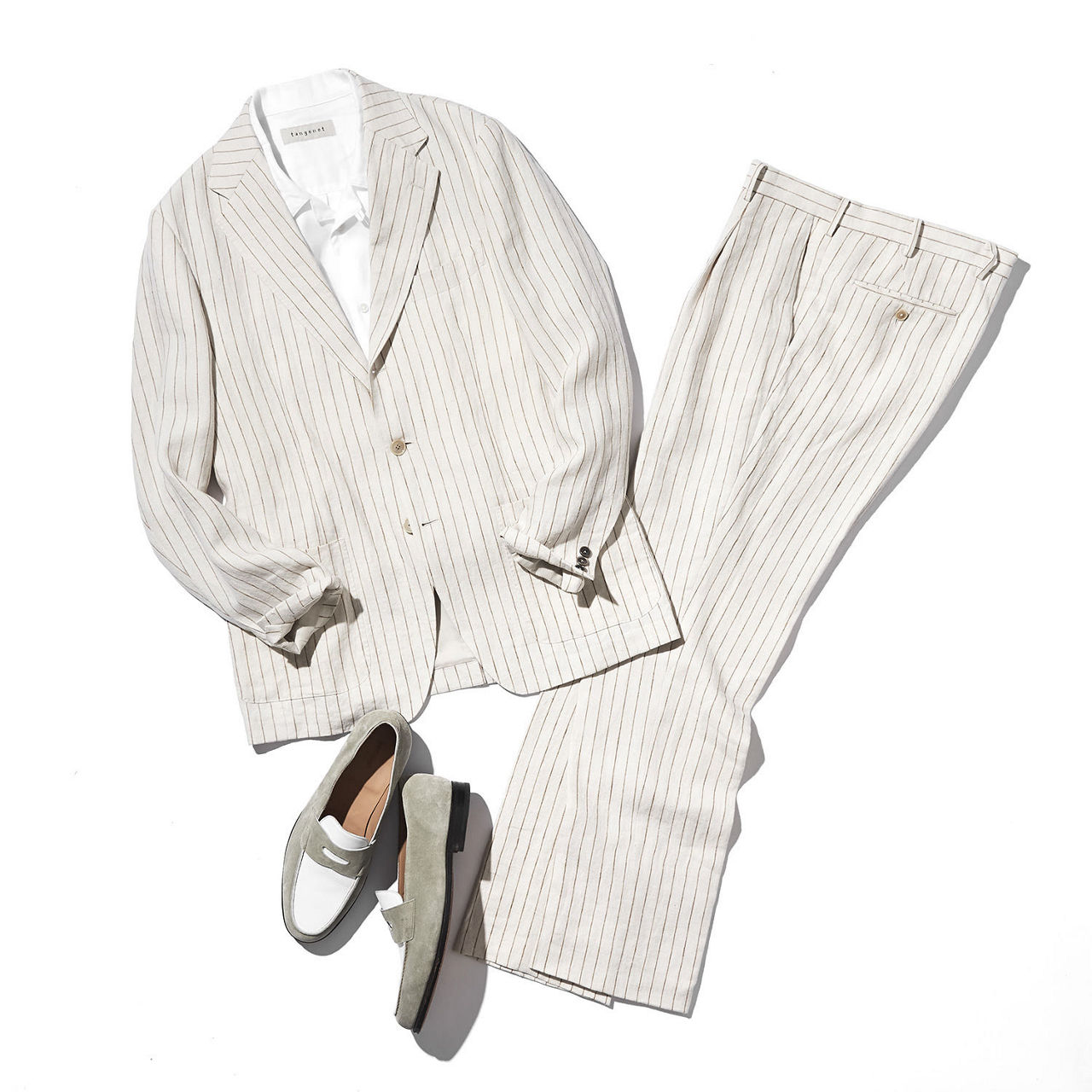 春夏のスーツに欠かせないリネン生地。軽快なステンレス素材のCODE 11.59の文字盤とストラップのグリーンに合わせて、淡いベージュのストライプ柄のセットアップをセレクト。白の開襟シャツに、ツートーンのローファーを素足で履けば、リゾートがお似合いの上品なスタイルに。