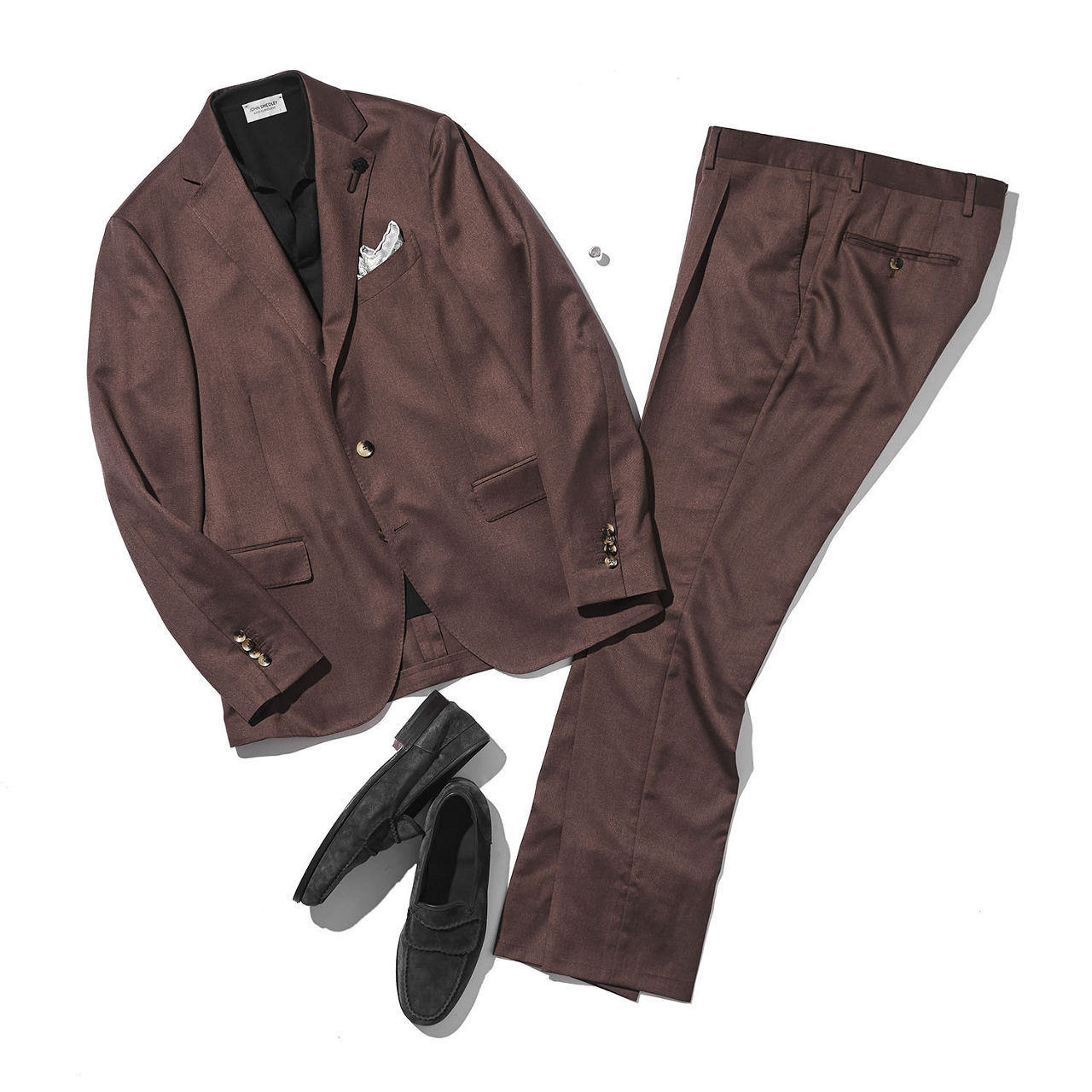 貫禄ある大人のスタイルに取り入れたい、褐色した肌にも馴染のよいブラウンスーツ。ウールに混紡したシルクがさりげなく輝くエレガントな佇まいのスーツに、スキッパーニットをラフに合わせて。上品さとカジュアルさが同居するCODE 11.59とも見事にフィットする。