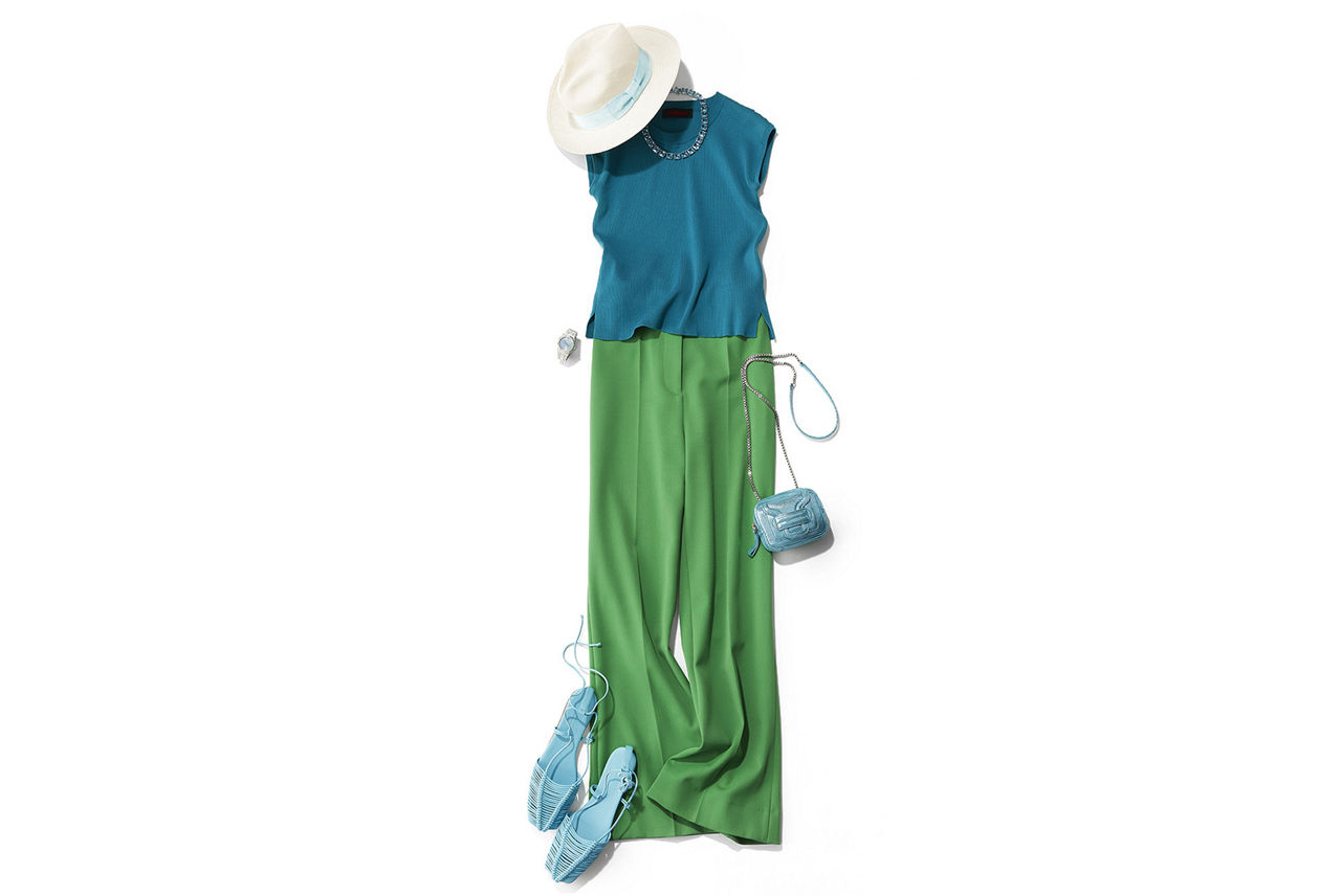 <女性>トップス¥23,100/キャバン(キャバン 代官山店 TEL:03-5489-5101)、パンツ¥50,600[参考価格]/ヴィヴィビー(イーストランド TEL:03-6231-2970)、ネックレス¥79,200/スワロフスキー・ジュエリー(スワロフスキー・ジャパン/コンシューマーサービス TEL:0120-10-8700)、バッグ¥64,900/ピエール アルディ(ピエール アルディ 東京 TEL:03-6712-6809)靴¥53,900/ヘリュー(エスケーパーズオンライン TEL:03-5464-9945)、そのほかスタイリスト私物