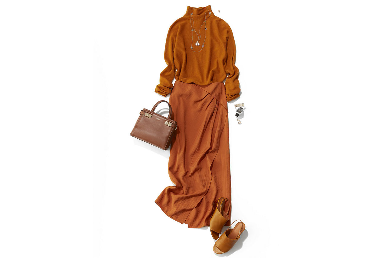 トレンドカラーでもあるブラウン系をワントーンで上品にまとめたスタイル。あえて足元はバックストラップのサンダルを合わせて抜け感を演出。腕時計の素材に合わせて、ピンクゴールドのジュエリーを選ぶと統一感を出すことができる。