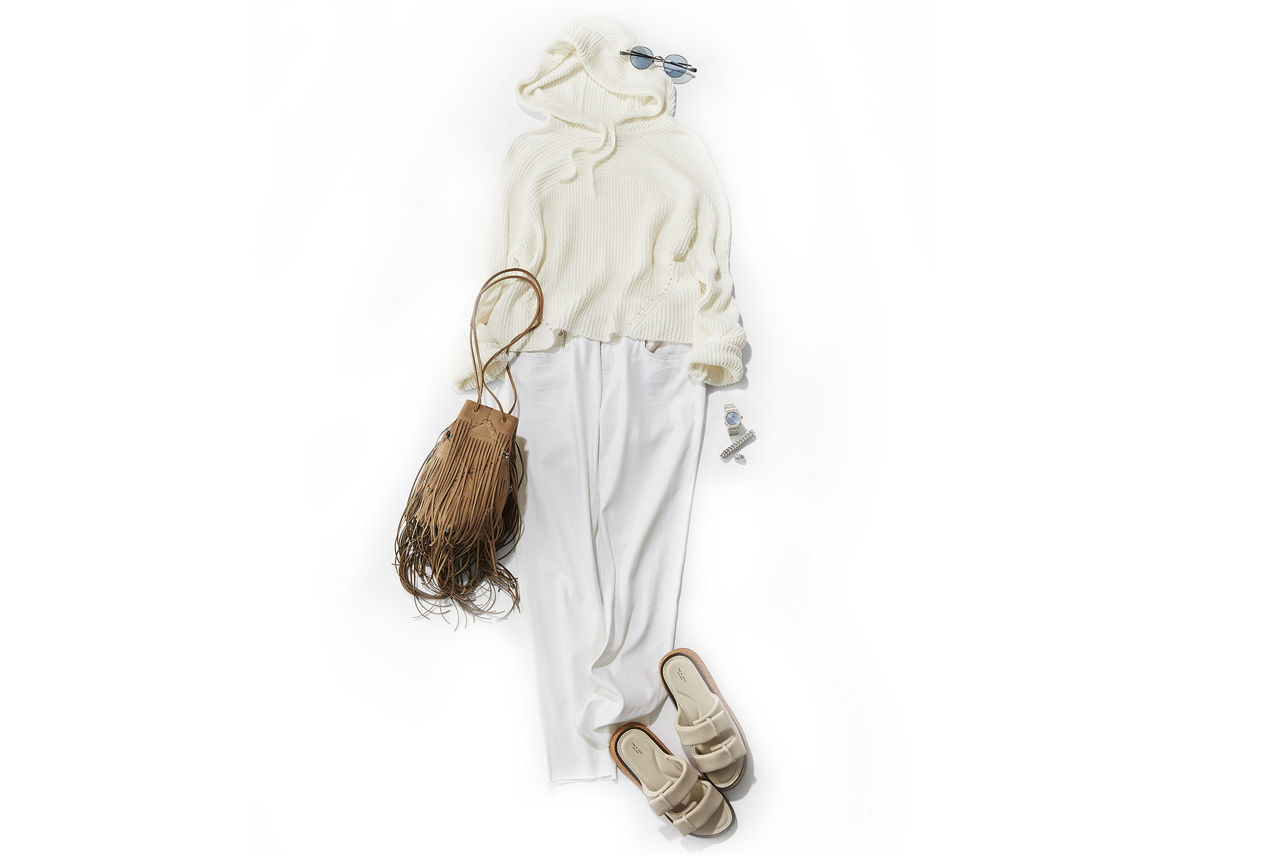 今季秋冬で注目したいオフワイト系デニムを先取り。トップスは柔らかな素材感のフーディーを選び、エクリュなワントーンで、クリーンで上品な装いに。サンドベージュのフリンジバッグで、シンプルコーデに程良いスパイスをプラスして。