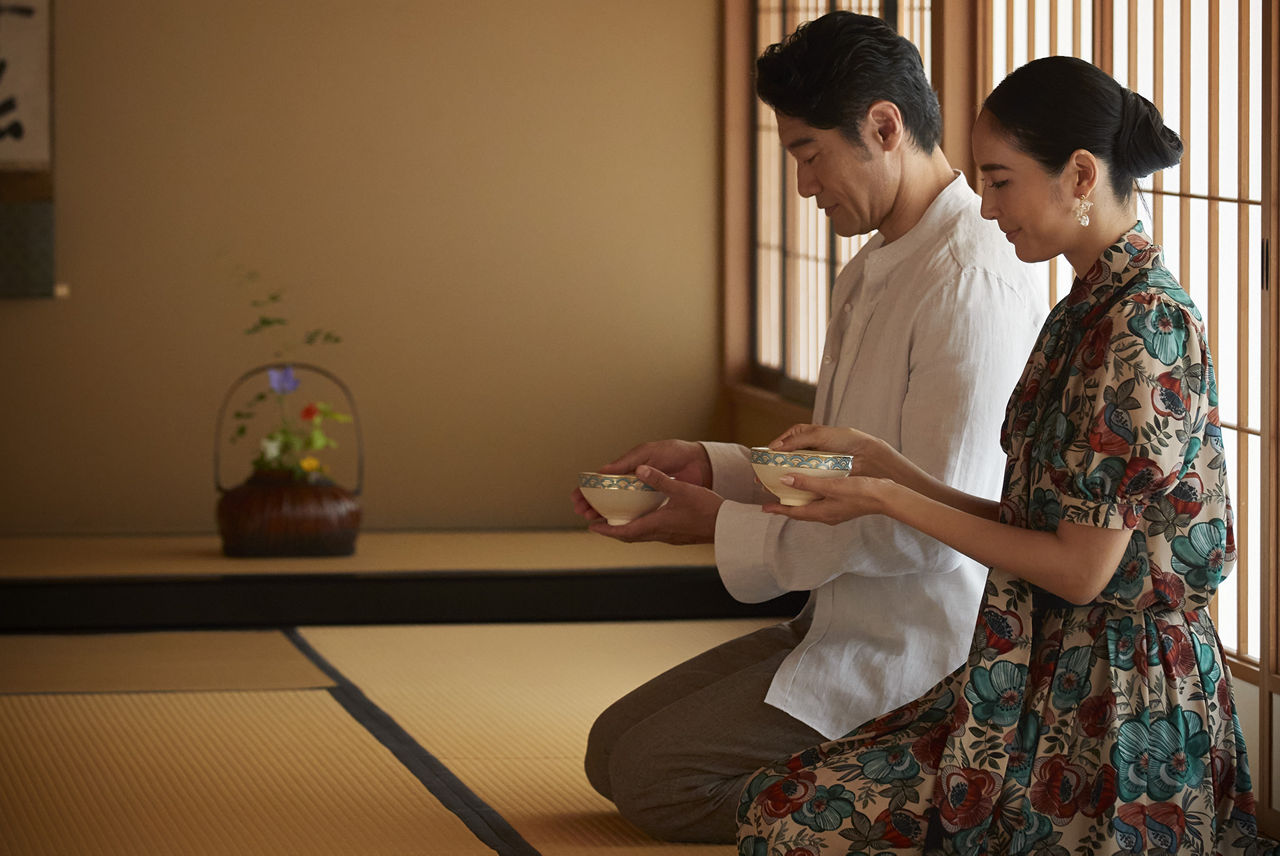 旅館へと向かう道中、休憩がてらに寄り道。深緑が生い茂る、石畳の小道を抜けると茶室に到着。和モダンなフラワープリントのブラウスとプリーツスカートのセットアップが、自然と場の雰囲気に溶け込む。柔らかなブラウスのボウタイがアクセントとなり、エレガントでフレッシュな装いに。腕元に添えたピンクゴールドの「ロイヤル オーク」とともに、抹茶を味わいながら癒しのひと時を。