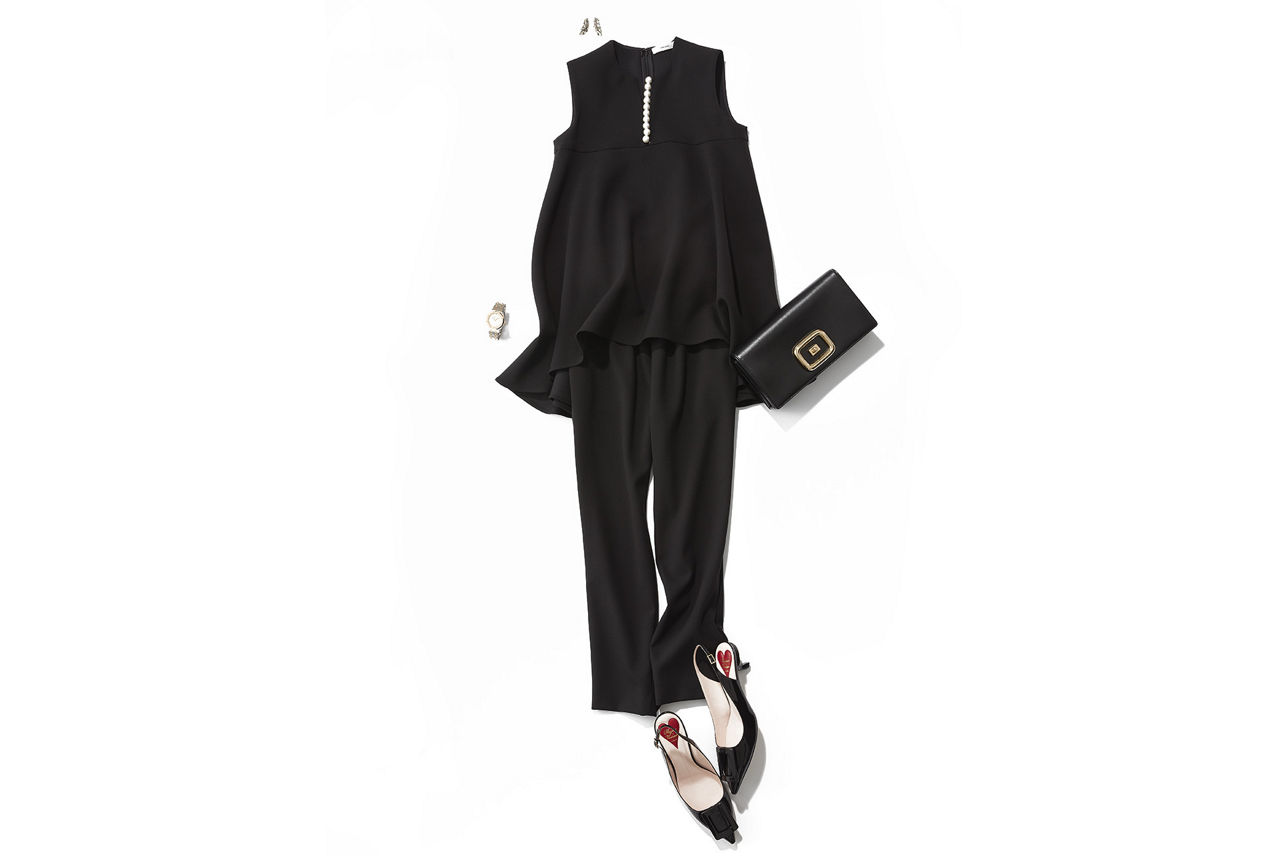 〈女性〉トップス¥59,400、パンツ¥49,500/ヨーコ チャン TEL:03-6434-0454、ピアス¥52,800/ライアン ストーラー(エストネーション TEL:0120-503-971)、バッグ¥407,000、靴¥116,600/ともにロジェ ヴィヴィエ(ロジェ・ヴィヴィエ・ジャパン TEL:0120-957-940)